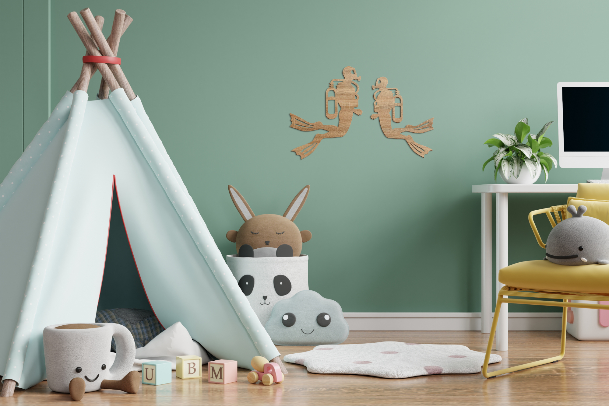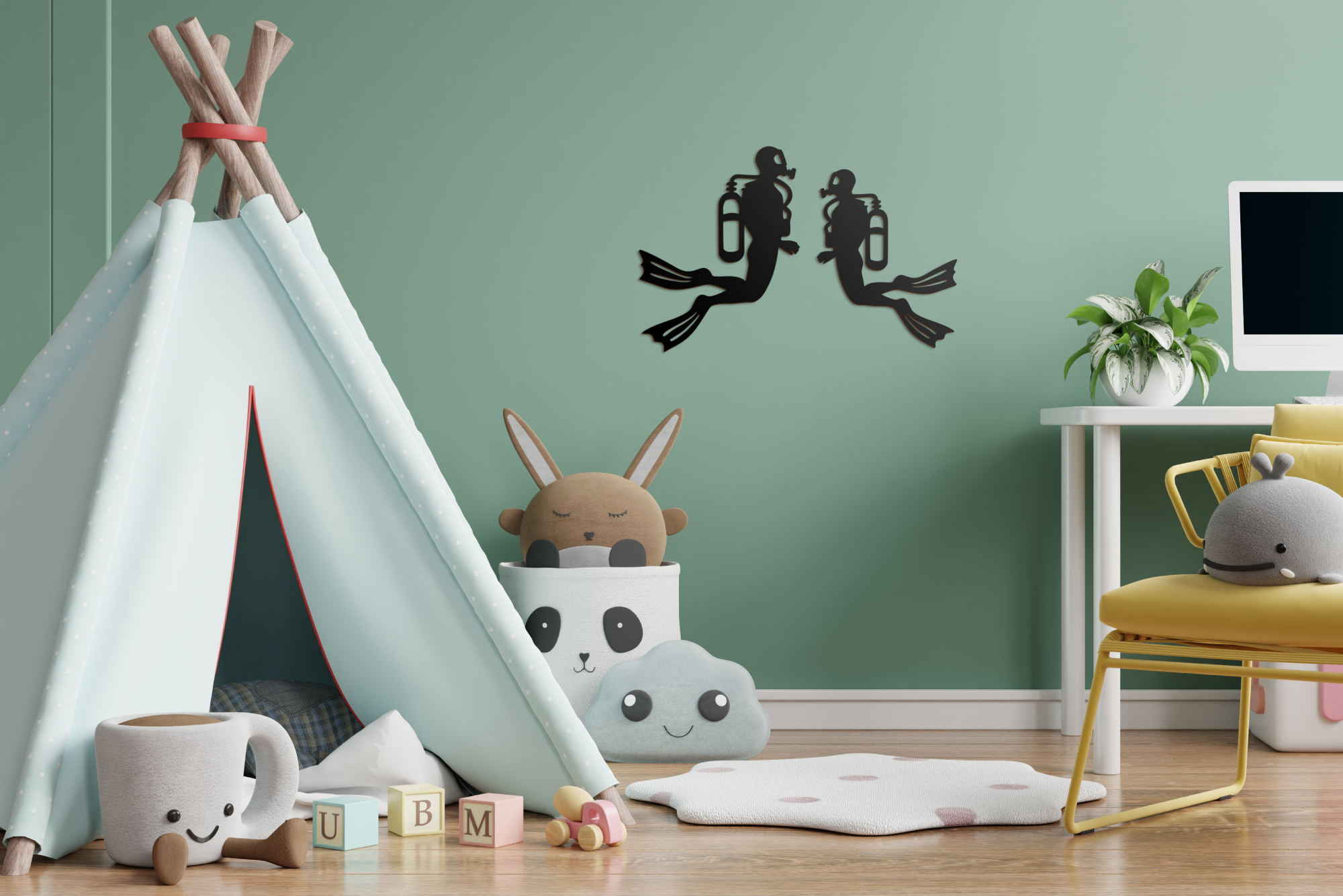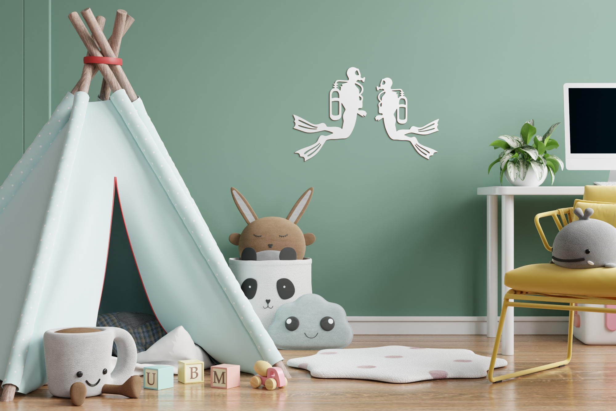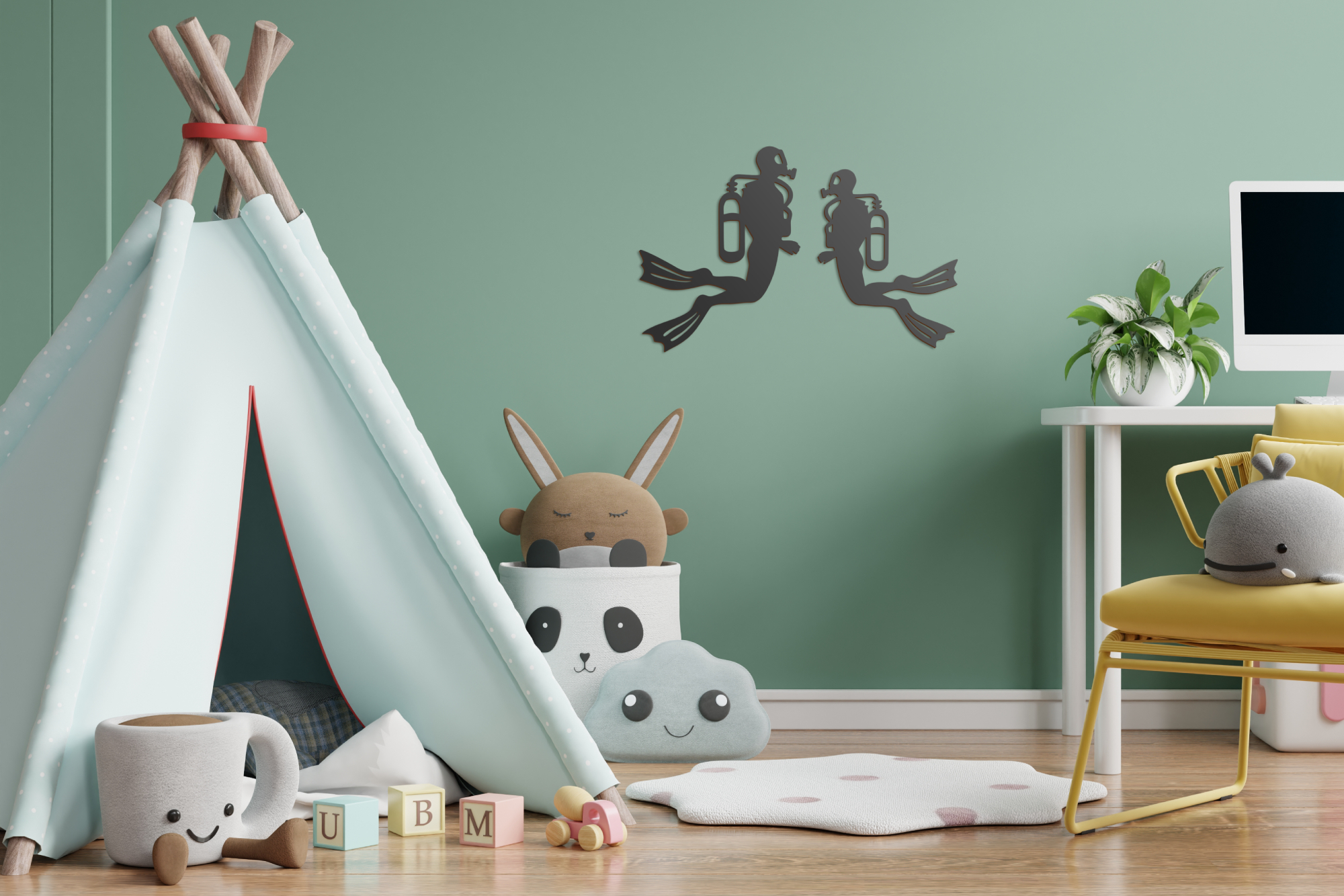 Önálló készülékes búvárkodásnál a könnyűbúvárok neoprén ruhába, búvármellénybe, és maszkba öltözve merülnek a mélybe, palackukban nitrogén és oxigén keveréke található, melyek aránya a víz mélységétől és víznyomástól függően változhatnak. Ez a két bátor búvár most othhonodat fedezheti fel! A termék a Víz Alatti Világ panoráma szett kiegészítő eleme, de nagyobb méretének köszönhetően önálló dekorációként is megállja helyét gyerekszobában, játszósarokban, óvodákban. Több féle méretben és színben elérhető, így biztosan megtalálod a Te falszínedhez és stílusodhoz illő változatot.