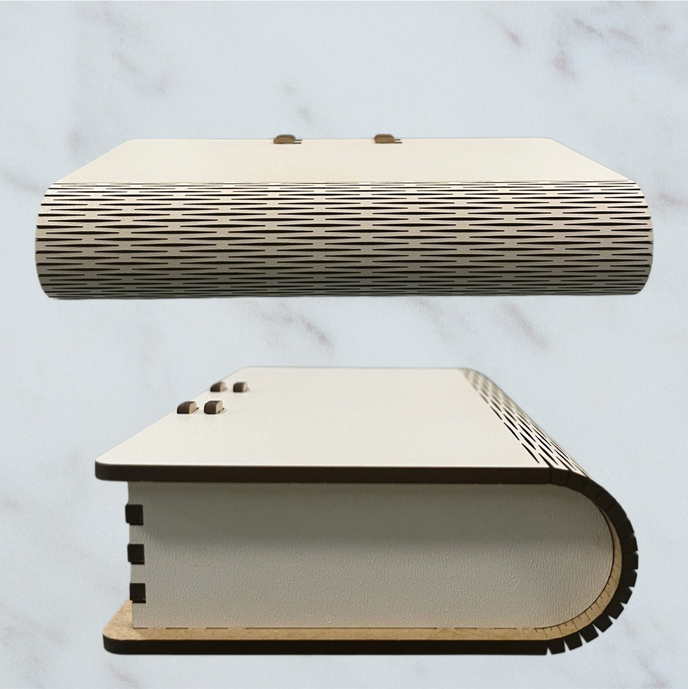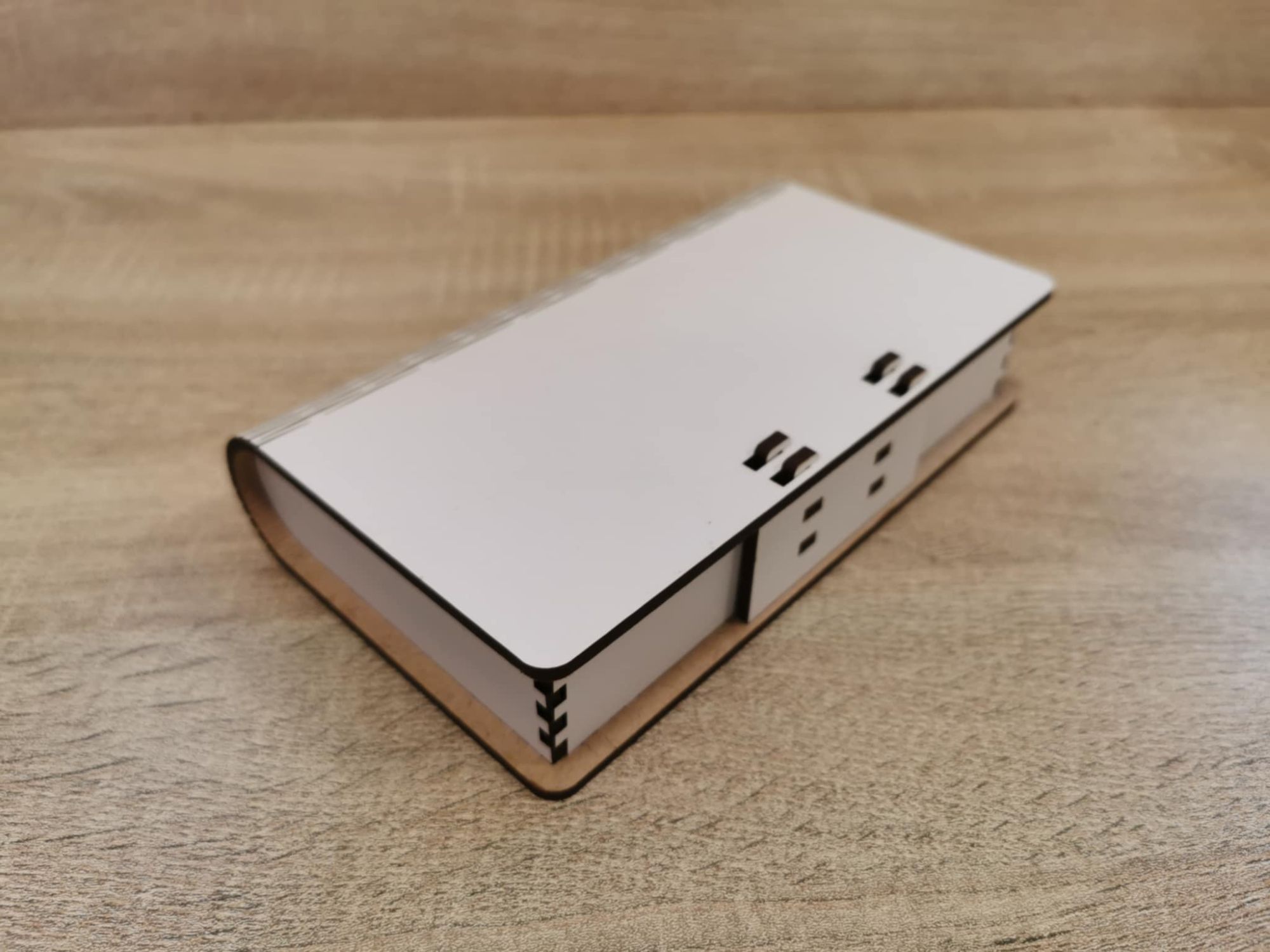 A HDF (High Density Fiberboard) farostból és gyantából préselt, nagy sűrűségű lemez. Gyakran újrahasznosított faanyagból készítik, ezzel minimalizálva a hulladékot, környezetbarátabbá téve a gyártási folyamatot. HDF lemezből készült termékeink lézertechnológiával készülnek, precíz lézervágónk egészen apró, összetett minták vágását is lehetővé teszi, így hihetetlenül részletes dizájnokat is tudunk készíteni. A lézer boxok többféle méretben és záródással készülnek, fedeleik külöböző módon mozognak. Az úgynevezett "living hinge" (élő zsanér) technológiával a sűrűn átvágott HDF lemezt hajlítani lehet, a szilárd 3 mm-es lemezből lekerekített éleket hozhatunk létre. A dobozok összeszerelése is változatos, van amelyik ragasztással történik, van amelyik egyszerűen egymásba pattanó, szorosan illeszkedő elemekből áll.