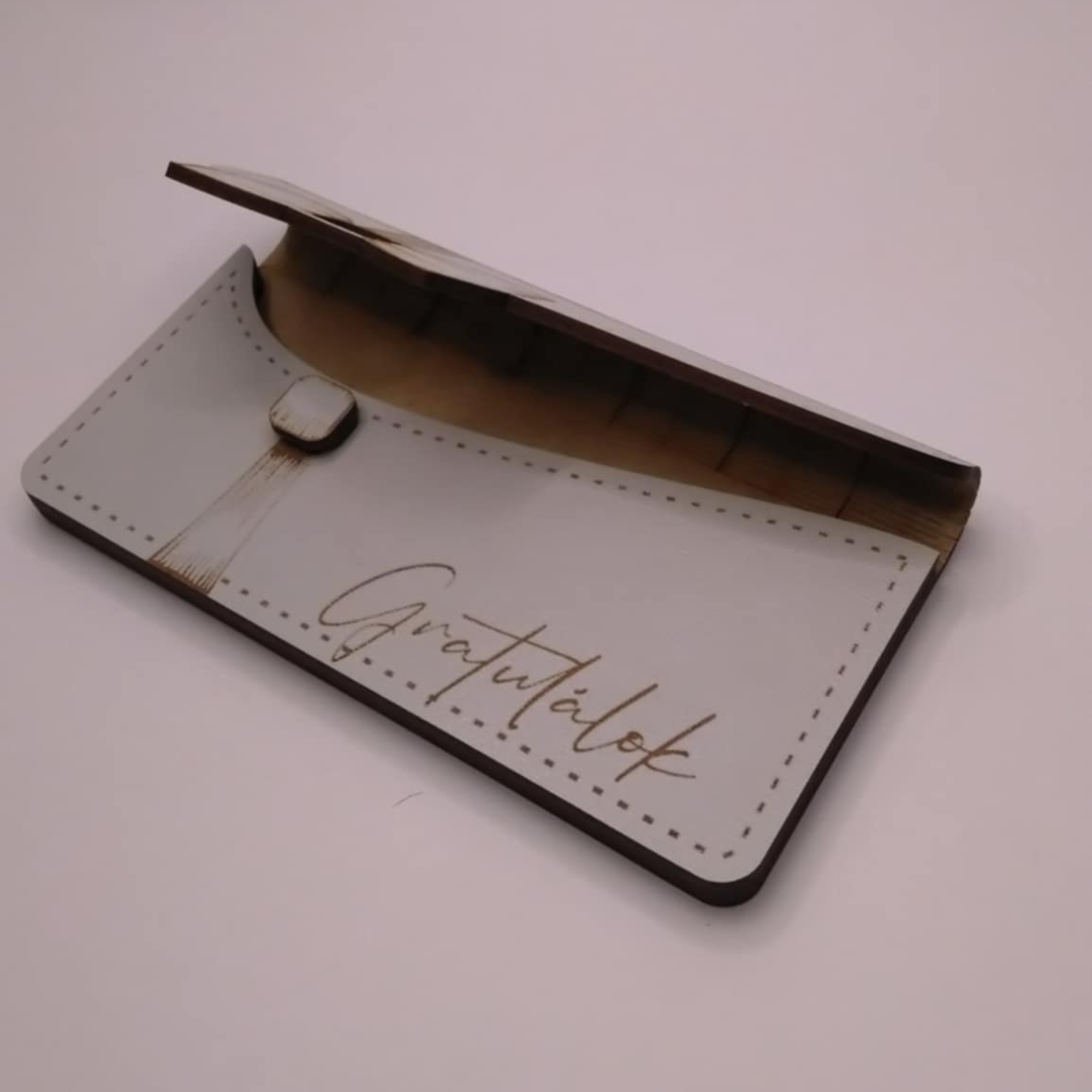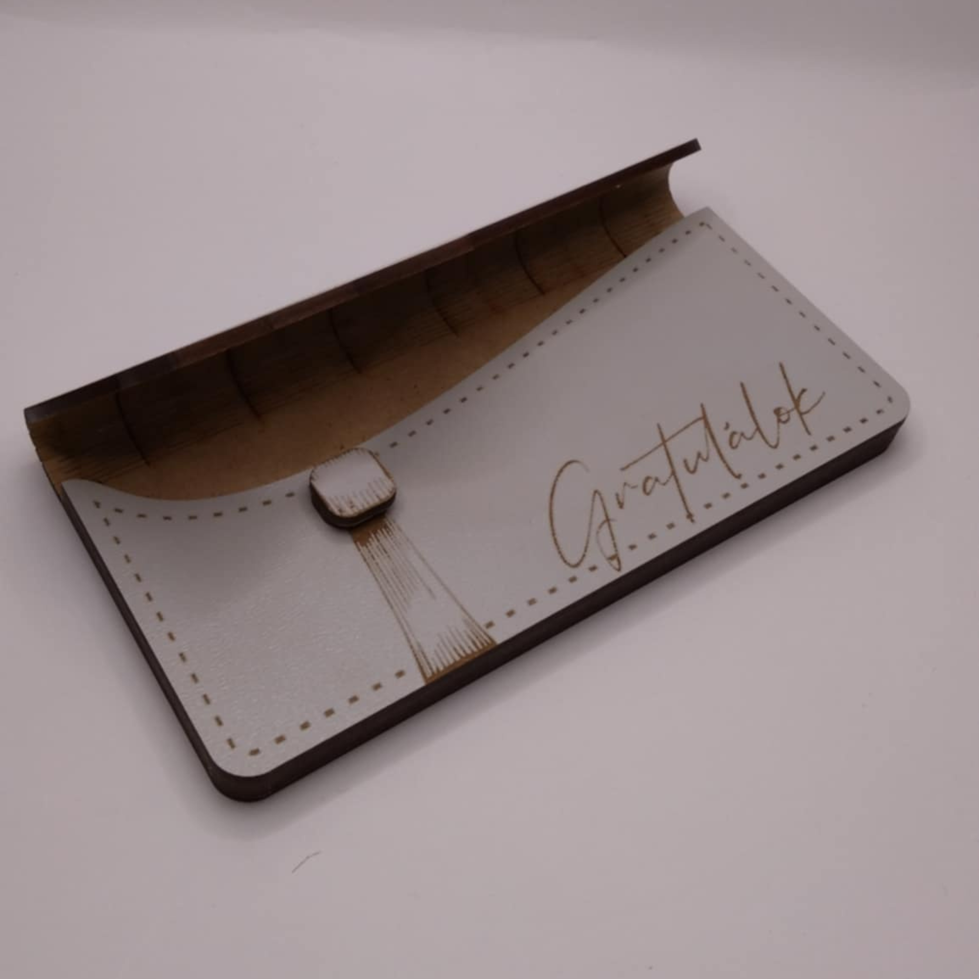 A „Gratulálok!” feliratú pénzátadó doboz masnis mintával díszített, elegáns megoldás pénz, utalvány vagy kisebb ajándék átadására. A lézervágott részletek és a gravírozott masni finom kidolgozása igazán különlegessé teszi.