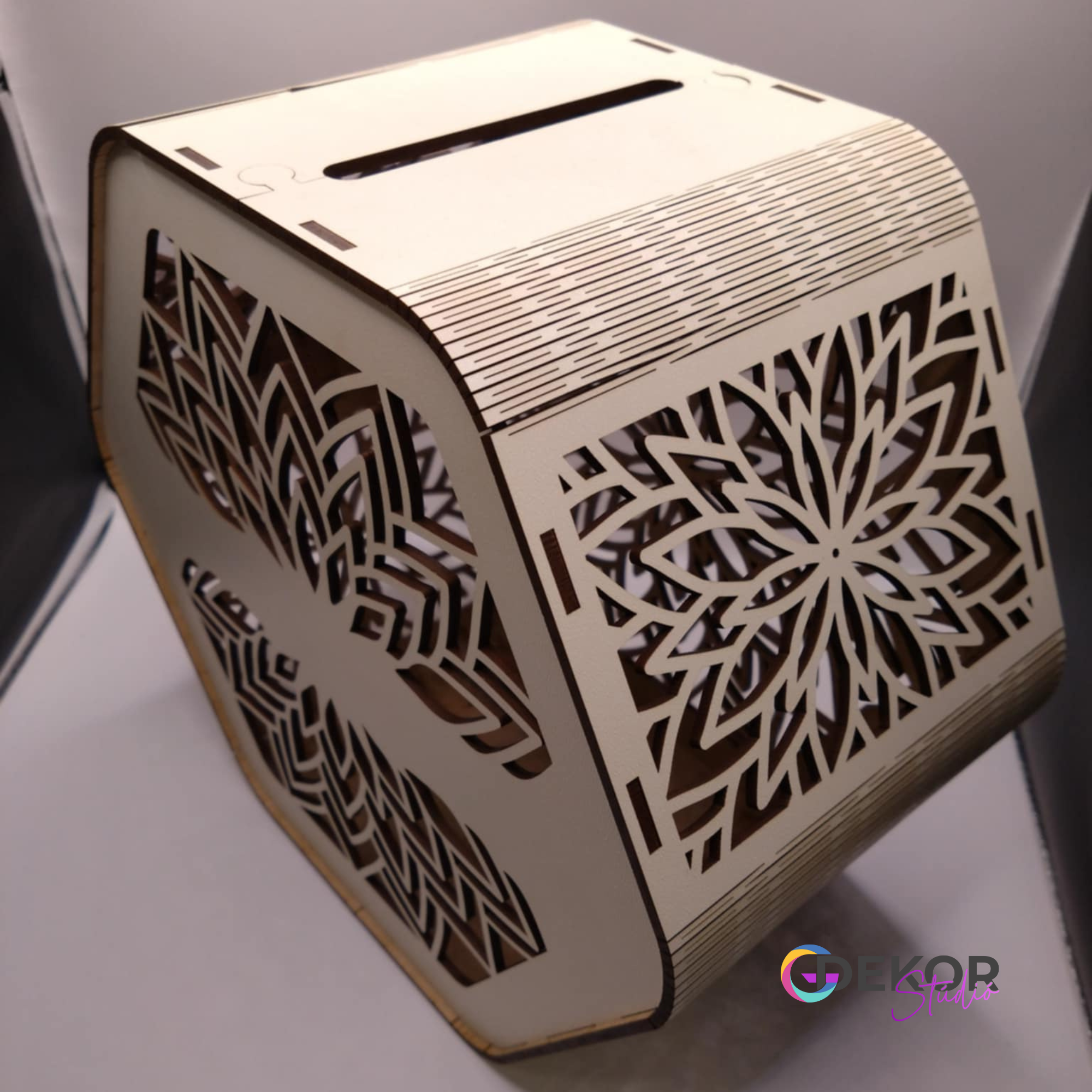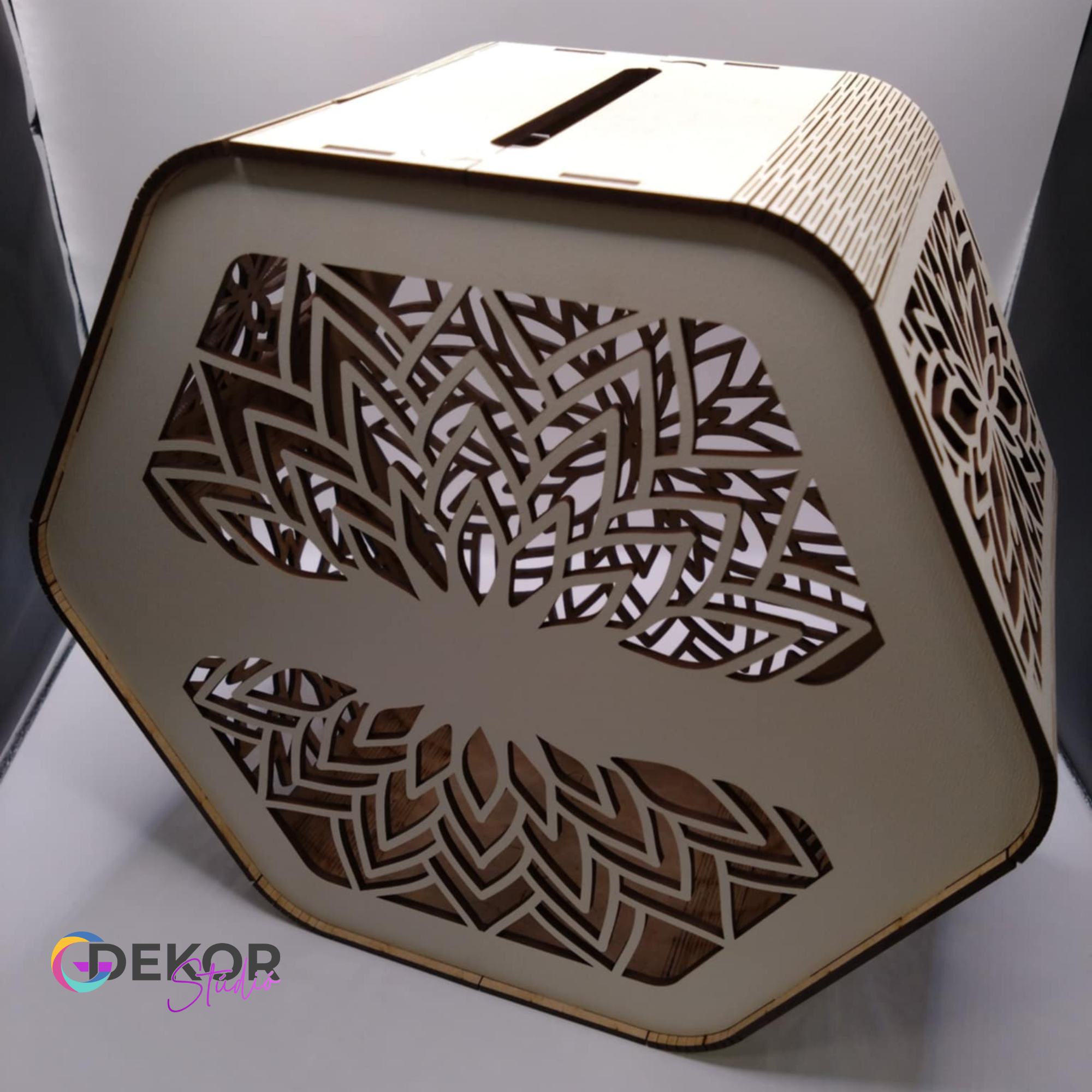 Ez a különleges esküvői pénzátadó doboz minőségi HDF lemezből, lézervágással és gravírozással készült, így egyszerre elegáns és tartós kiegészítője a nagy napnak. A hatszögletű forma és a gazdag virágmintás díszítés romantikus hangulatot teremt, miközben praktikus megoldást nyújt a borítékok és pénzajándékok gyűjtésére.