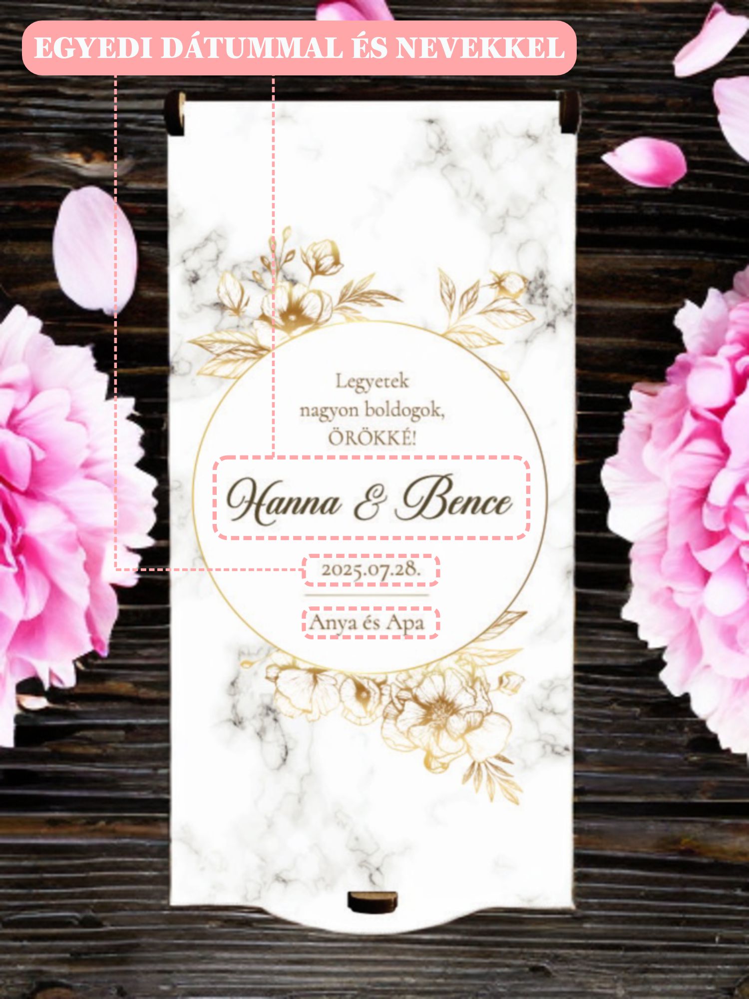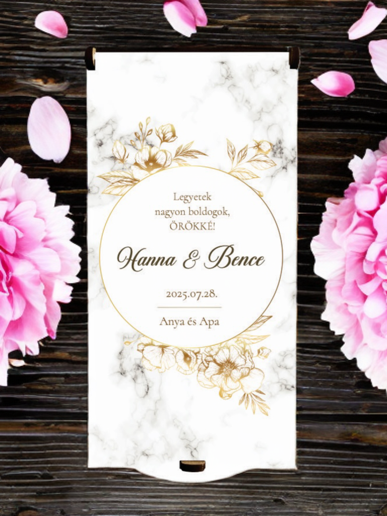 Tedd még különlegessebbé a nagy napot – ez az UV nyomtatott, márvány mintás pénzátadó doboz tökéletes választás, ha pénzt ajándékoznál a friss házasoknak, de nem akarsz sablonos megoldással élni. A borítékoktól személyesebb, maradandó módja a készpénz átadásának egy lézervágott ajándékkísérő doboz. Rendelésnél az egyedi szöveg mezőbe írd be a pár nevét, dátumot és az ajándékozó nevét.