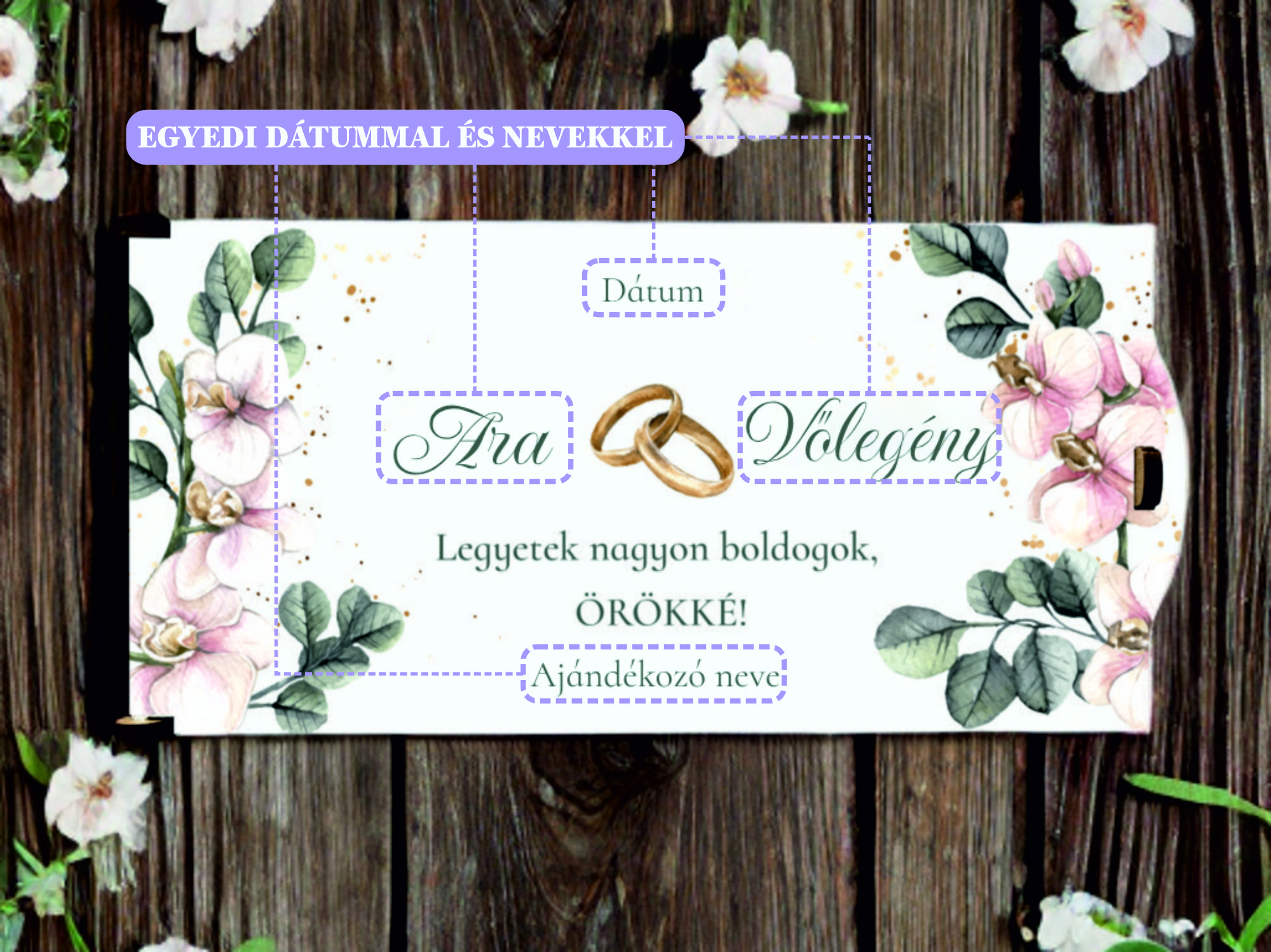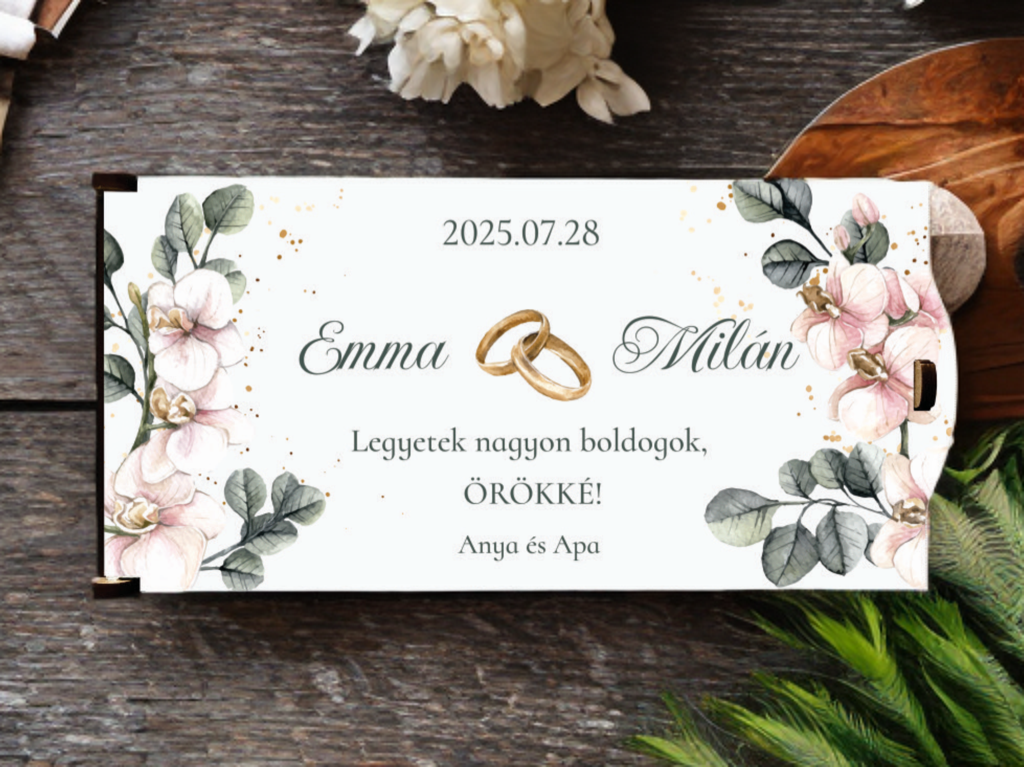 Tedd még különlegessebbé a nagy napot – ez az UV nyomtatott, virág és levél mintás pénzátadó doboz tökéletes választás, ha pénzt ajándékoznál a friss házasoknak, de nem akarsz sablonos megoldással élni. Ezt az elegáns mintát a jelenleg népszerű gold & greenery stílus inspirálta. A borítékoktól személyesebb, maradandó módja a készpénz átadásának egy lézervágott ajándékkísérő doboz. Rendelésnél az egyedi szöveg mezőbe írd be a pár nevét, dátumot és az ajándékozó nevét.