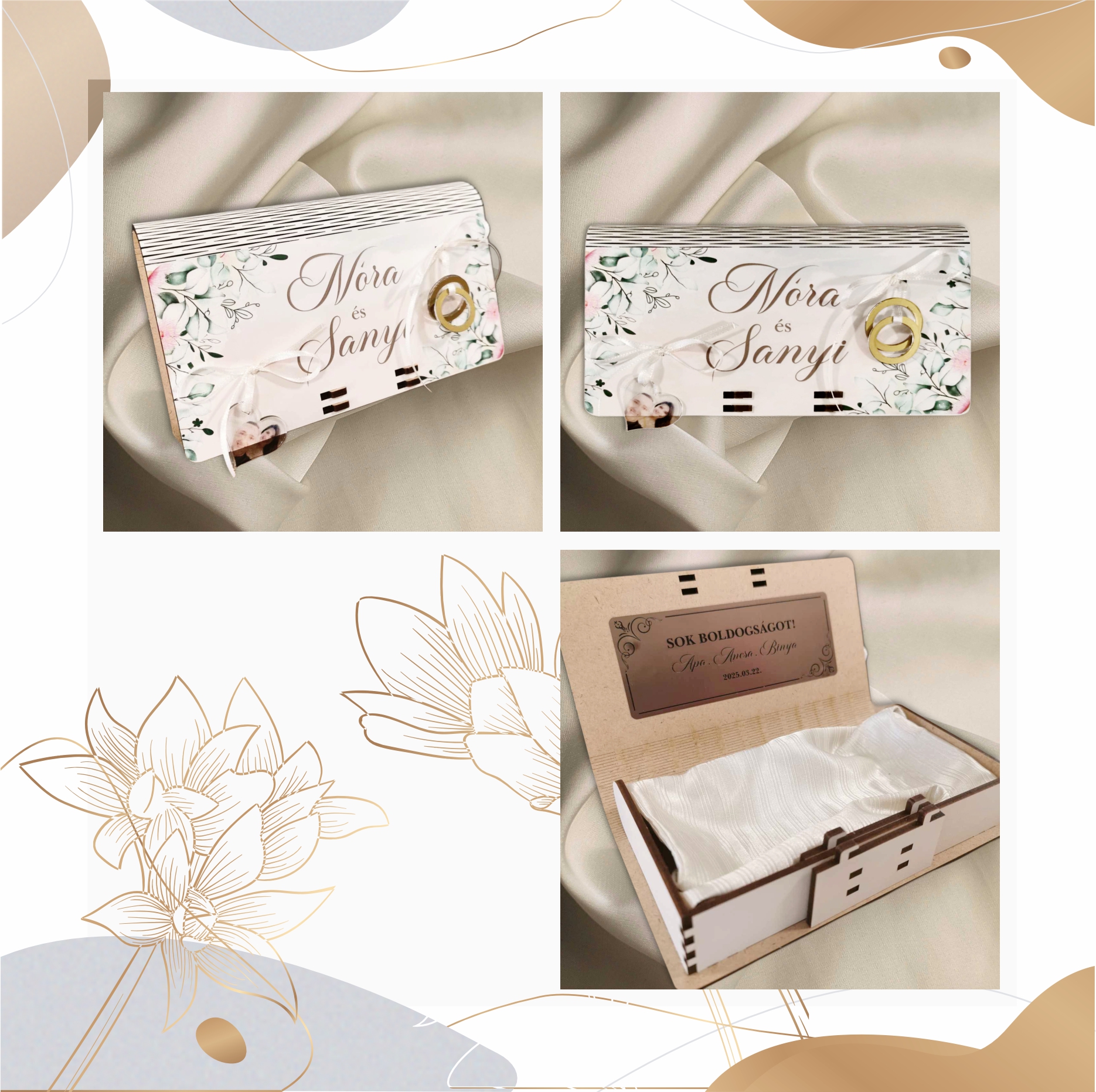 A belső részben gravírozott fólia található, amely egyedi felirattal, idézettel vagy jókívánsággal tehető még személyesebbé. A doboz rekeszeiben biztonságosan elhelyezhető a pénzajándék, utalvány, akár ékszer, miközben maga az átadó doboz elegáns, maradandó emlékként megőrizhető az ifjú pár számára.