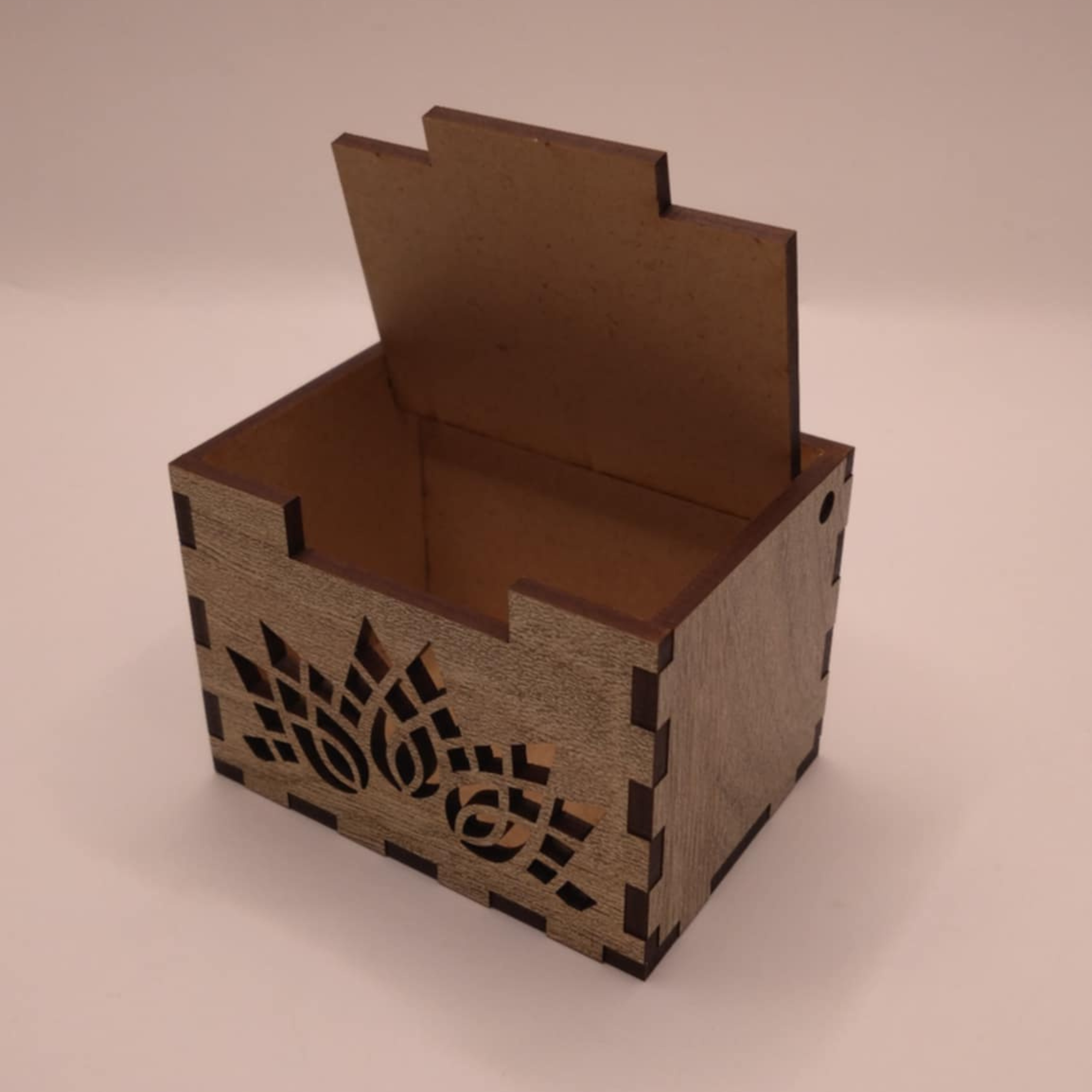A HDF (High Density Fiberboard) farostból és gyantából préselt, nagy sűrűségű lemez. Gyakran újrahasznosított faanyagból készítik, ezzel minimalizálva a hulladékot, környezetbarátabbá téve a gyártási folyamatot. HDF lemezből készült termékeink lézertechnológiával készülnek, precíz lézervágónk egészen apró, összetett minták vágását is lehetővé teszi, így hihetetlenül részletes dizájnokat is tudunk készíteni. A lézer boxok többféle méretben és záródással készülnek, fedeleik külöböző módon mozognak. Az úgynevezett "living hinge" (élő zsanér) technológiával a sűrűn átvágott HDF lemezt hajlítani lehet, a szilárd 3 mm-es lemezből lekerekített éleket hozhatunk létre. A dobozok összeszerelése is változatos, van amelyik ragasztással történik, van amelyik egyszerűen egymásba pattanó, szorosan illeszkedő elemekből áll.