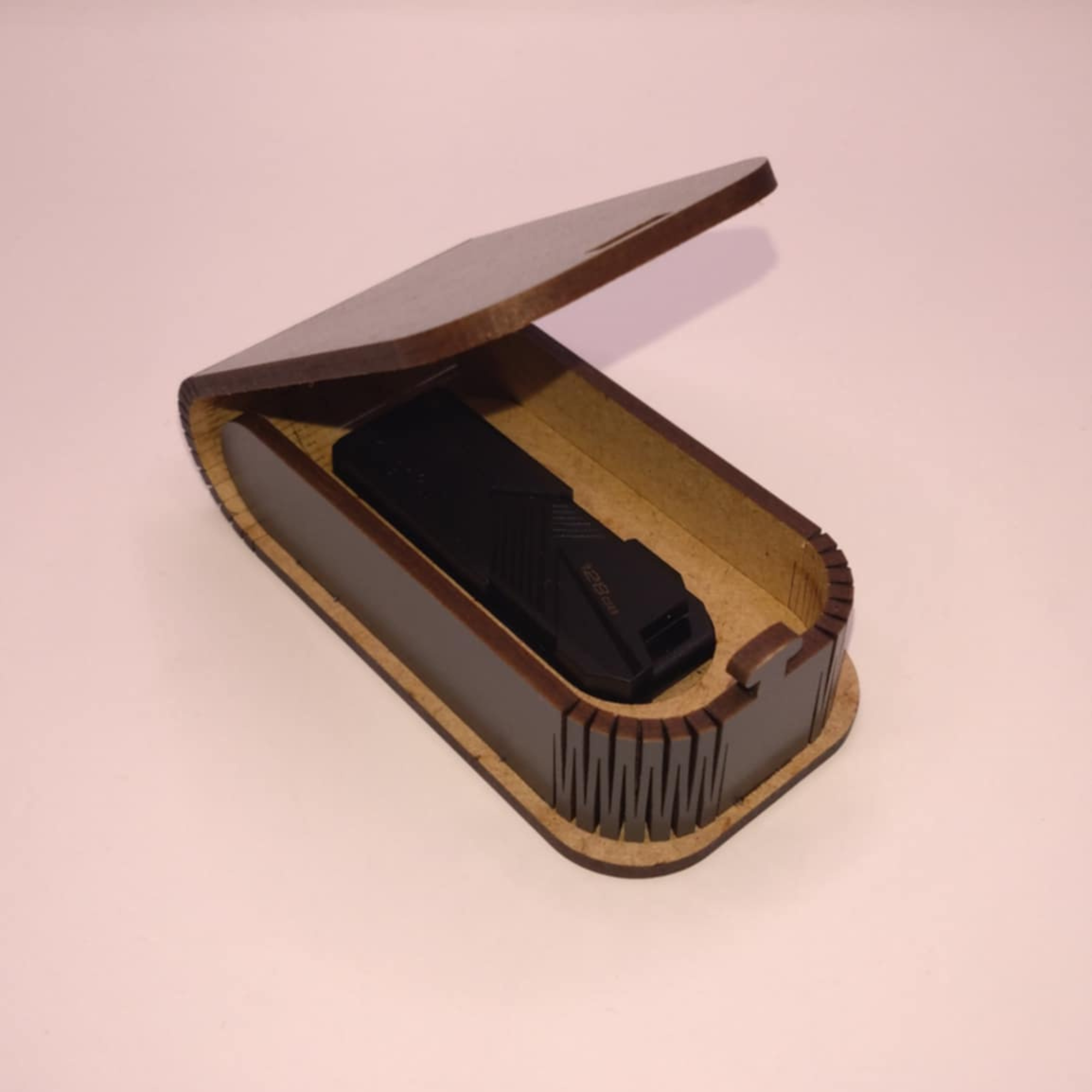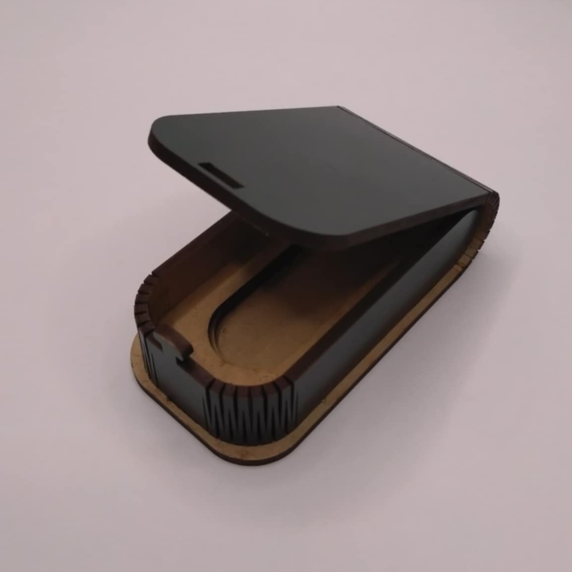 A tartó 3 mm vastag HDF lemezből készül, hajlított oldalfalakkal, amely elegáns ívet ad a doboznak. Precíz lézervágással kialakított, könnyű, mégis strapabíró szerkezet, amely hosszú távon megőrzi minőségét.
