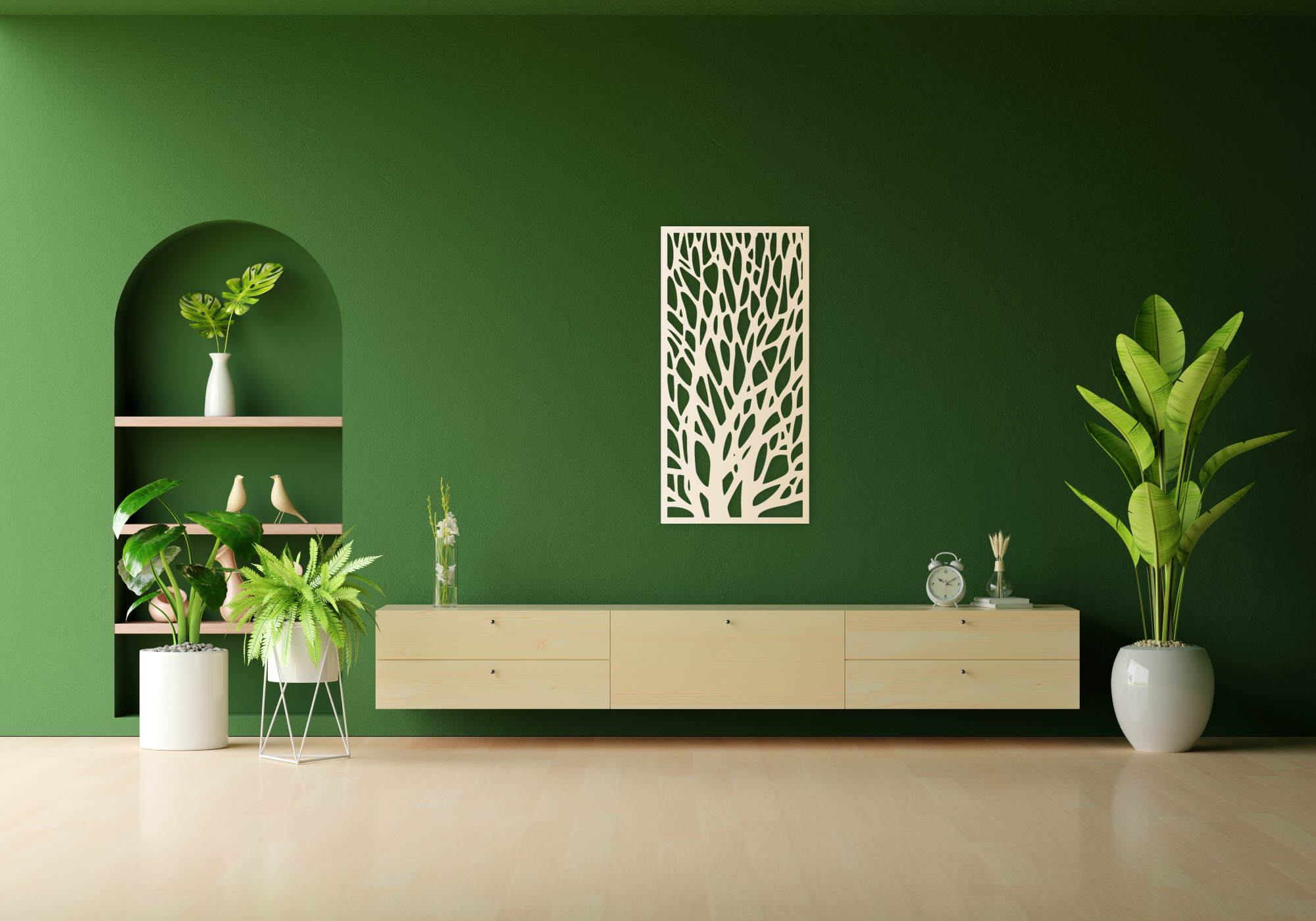 A HDF (High Density Fiberboard) farostból és gyantából préselt, nagy sűrűségű lemez. Gyakran újrahasznosított faanyagból készítik, ezzel minimalizálva a hulladékot, környezetbarátabbá téve a gyártási folyamatot. HDF lemezből készült falpaneleink lézertechnológiával készülnek, precíz lézervágónk egészen apró, összetett minták vágását is lehetővé teszi, így hihetetlenül részletes dizájnokat is tudunk készíteni. Ennek köszönhetően minden darab teljesen egyforma, lehetővé téve, hogy több darabból terülőmintát hozzunk létre. A HDF lemez szilárd, azonban 3 mm-es vastagságának köszönhetően otthon is könnyen vágható, fúrható. Nem forgácsolódik, csak finom port hagy maga után. Más három dimenziós faldekorációkhoz képest sokkal könnyebb, fúrás és szegelés nélkül is könnyedén rögzíthető. Habosított kétoldalú ragasztószalaggal, vagy pisztolyos ragasztókkal egyszerűen és gyorsan felhelyezhető falfelületekre. Nagyobb méretű képeket érdemes szeggel rögzíteni. Javasoljuk, hogy kis fejű szögeket vásároljon. A szög feje segít a terméket a falhoz rögzíteni. A termékek áttört mintájának köszönhetően a falpanelek szögekre akaszthatóak anélkül, hogy megsértse a panelt. További javaslatokért nézze meg Szerelési Útmutatónkat.