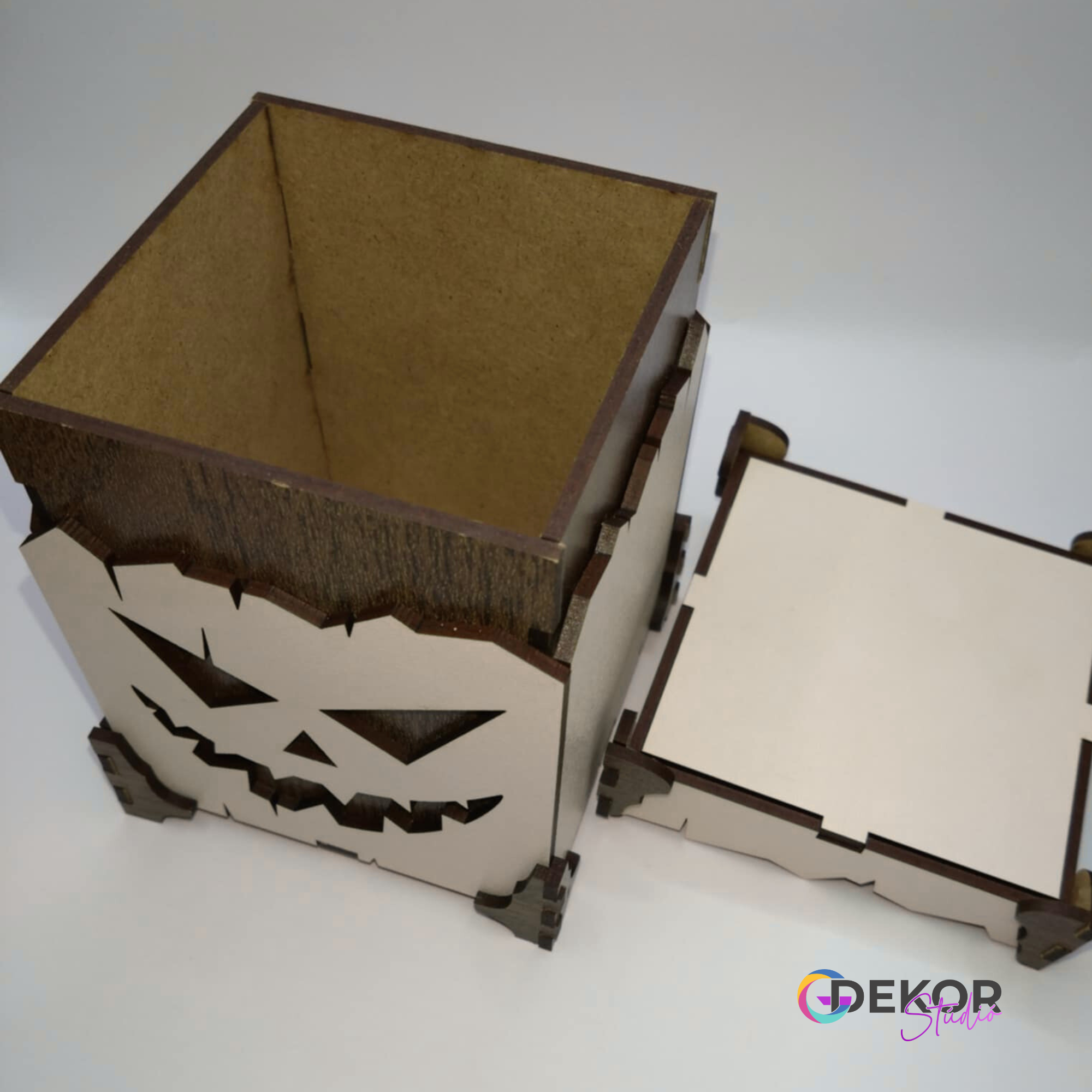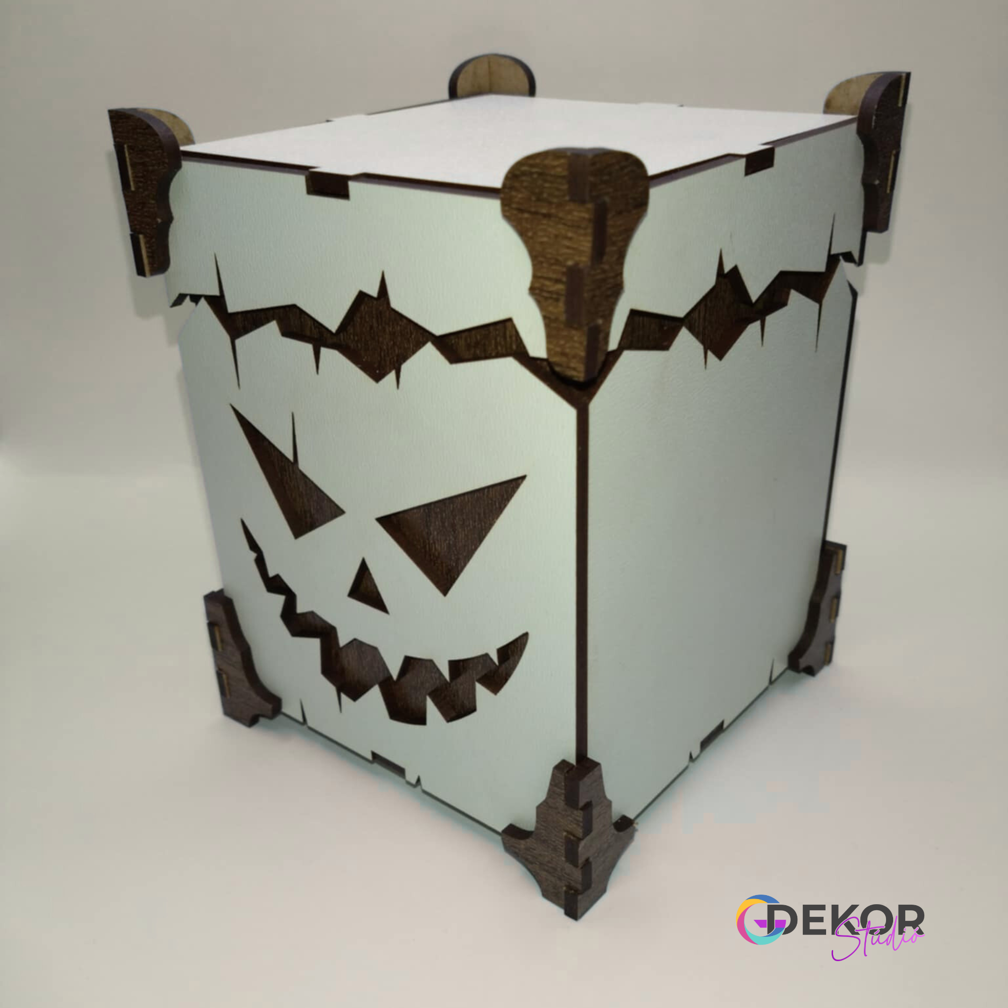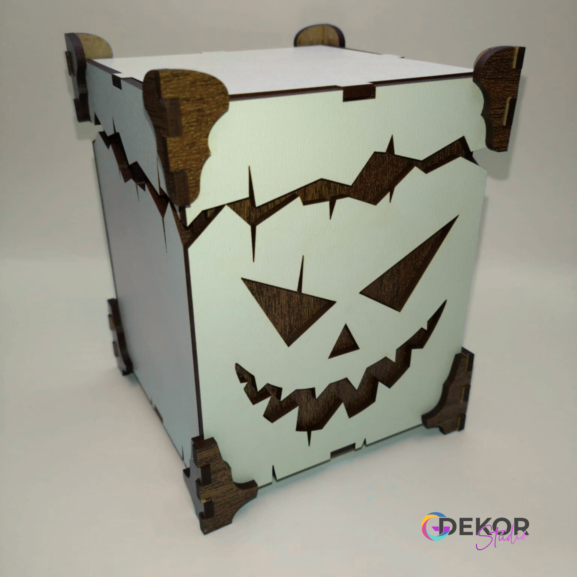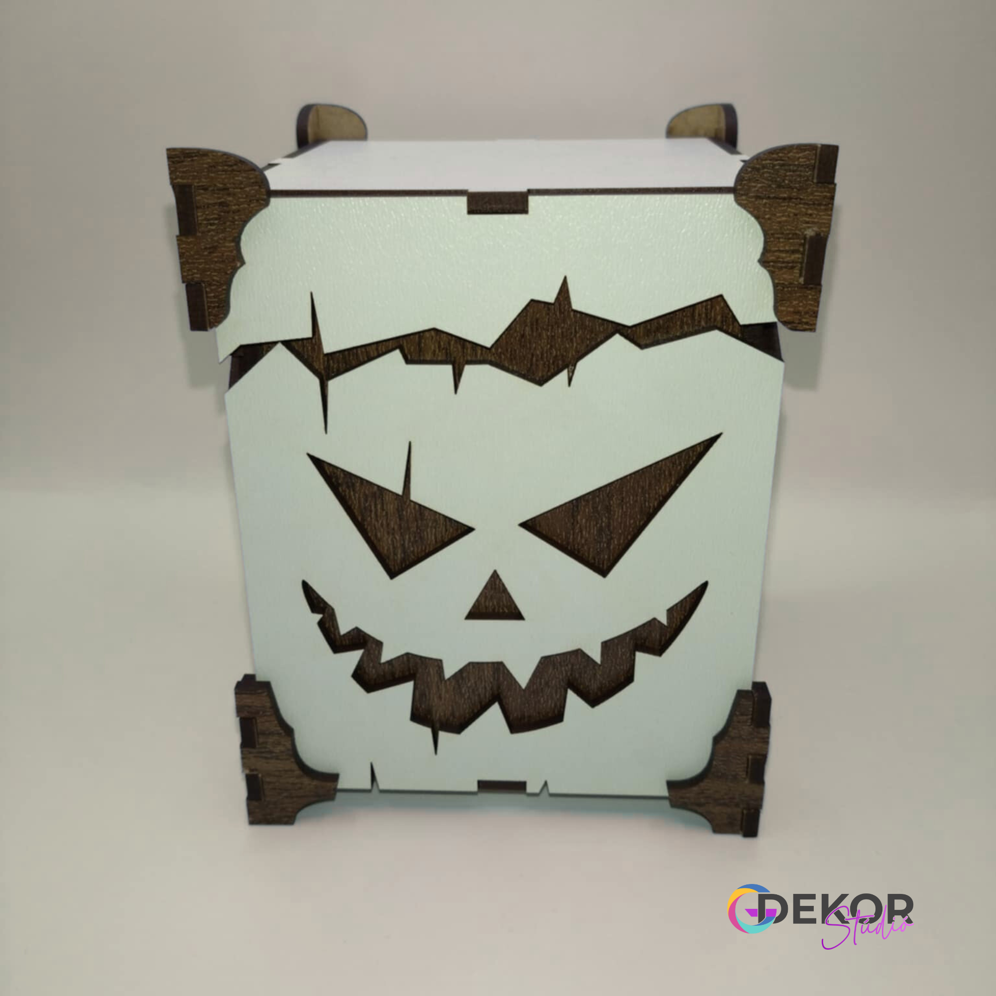 A fa doboz szögletes formáját a részletgazdag, faragott töklámpás-minta teszi igazán karakteressé. Nem csupán praktikus tároló, hanem egy hangulatteremtő darab, amely feldobja a Halloween estét.