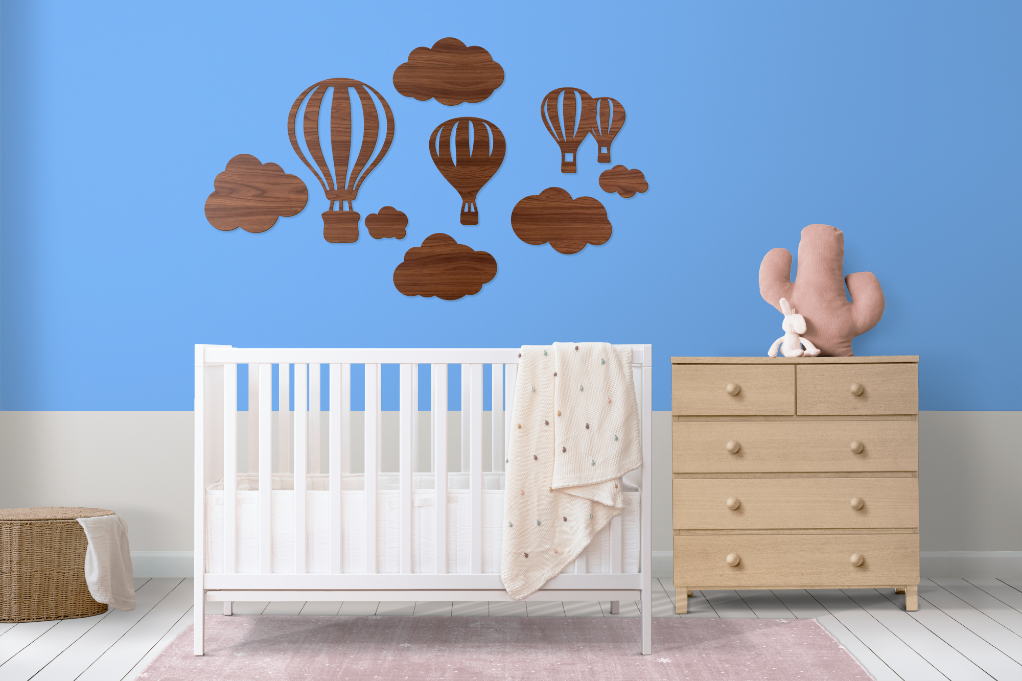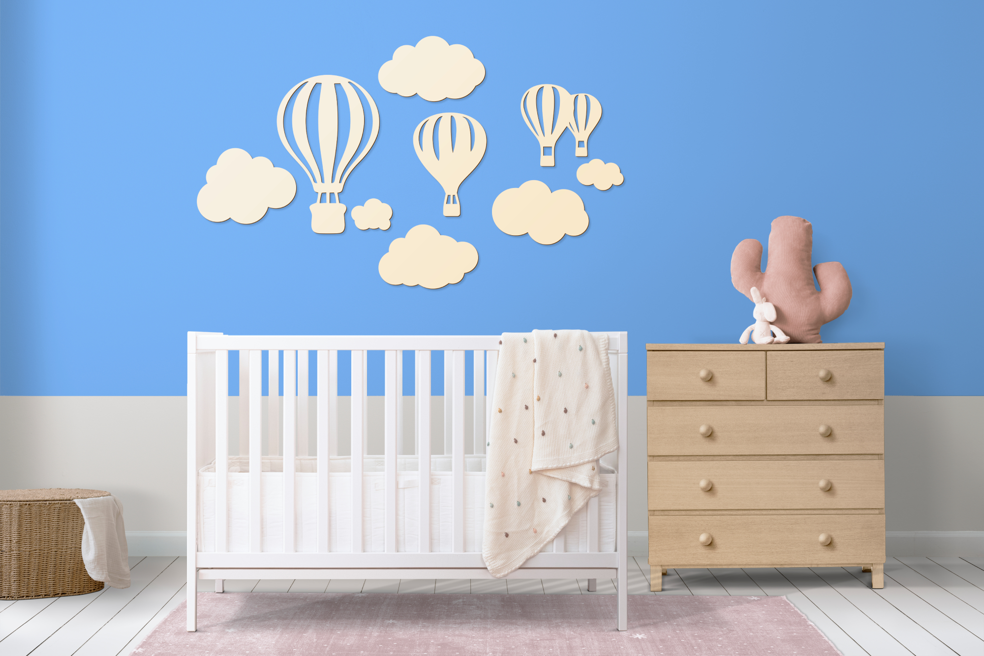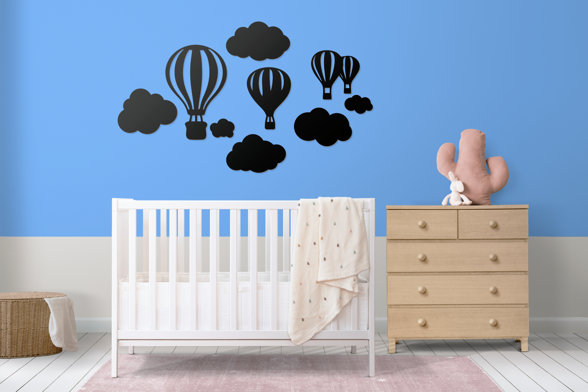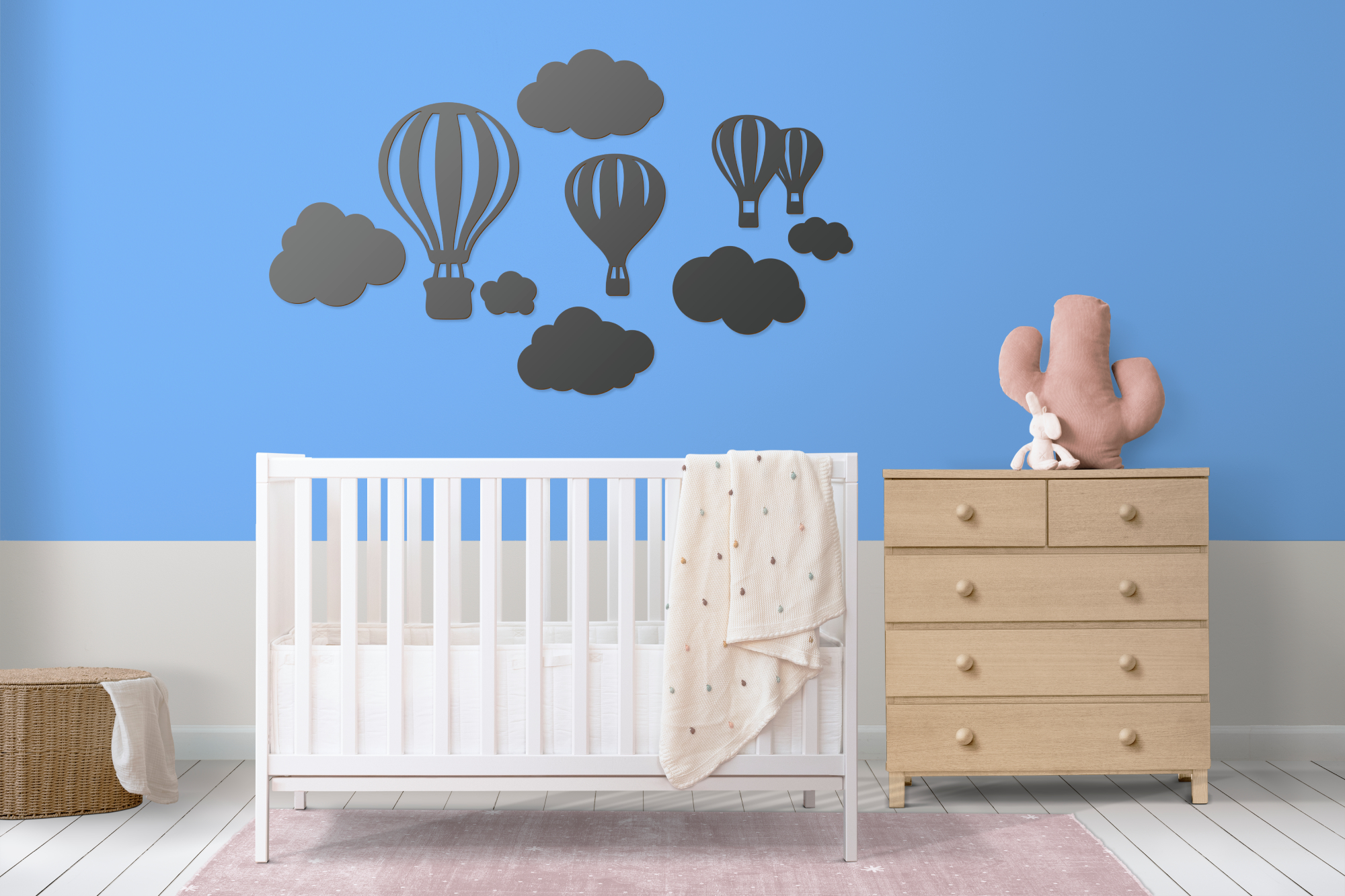Bolyhos bárányfelhőkkel és mesébe illő hőlégballonokkal terveztük ezt a kilenc darabos szettet. Varázsolj otthonod üres falából egy gyönyrű, felhős tájképet! A szettben két egyedül álló és egy páros ballon (455 x 294 mm, 297 x 210 mm, 232 x 235 mm) és hat különböző méretű felhő található. Az ár a szettre értendő, a feltűntetett méret a fotókon illusztrált elrendezésre vonatkozik, de egyéb elrednezésben, akár több falfelületen szétszórva is elhelyezheted őket.
