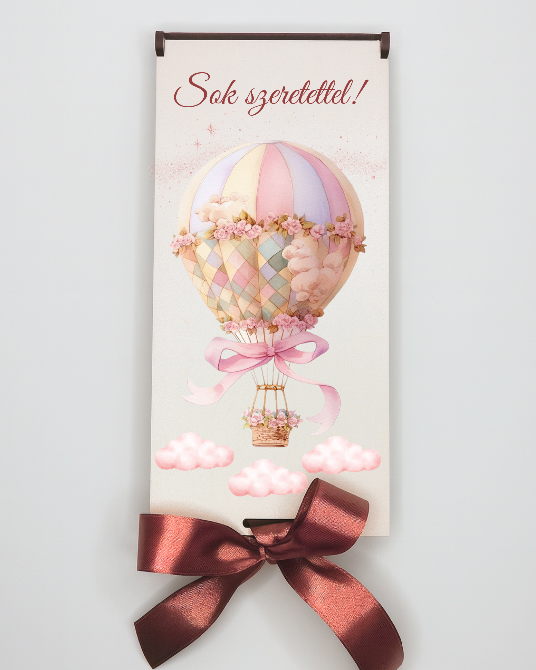 Ez a mesés hőlégballonos pénzátadó doboz igazi álomvilágot idéz! A pasztell színek, rózsaszín felhők és a szatén masni romantikus és elegáns hangulatot árasztanak.