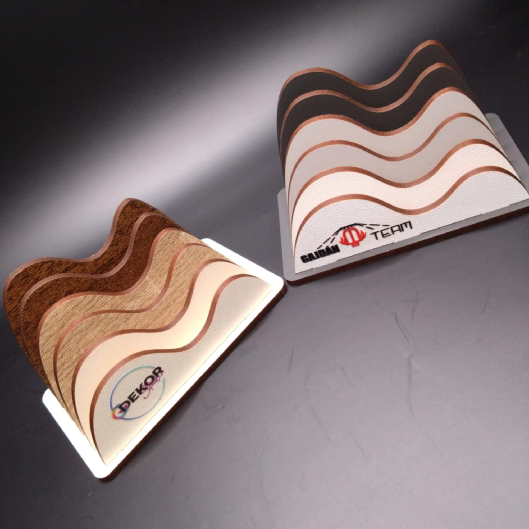 Ez a hullámos formájú fa tartó elegáns és modern megoldás névjegykártyák, prospektusok vagy szórólapok bemutatására. Egyedi kialakítása nemcsak praktikus, hanem figyelemfelkeltő is, így ideális választás irodákba, bemutatótermekbe, rendezvényekre és kiállításokra.