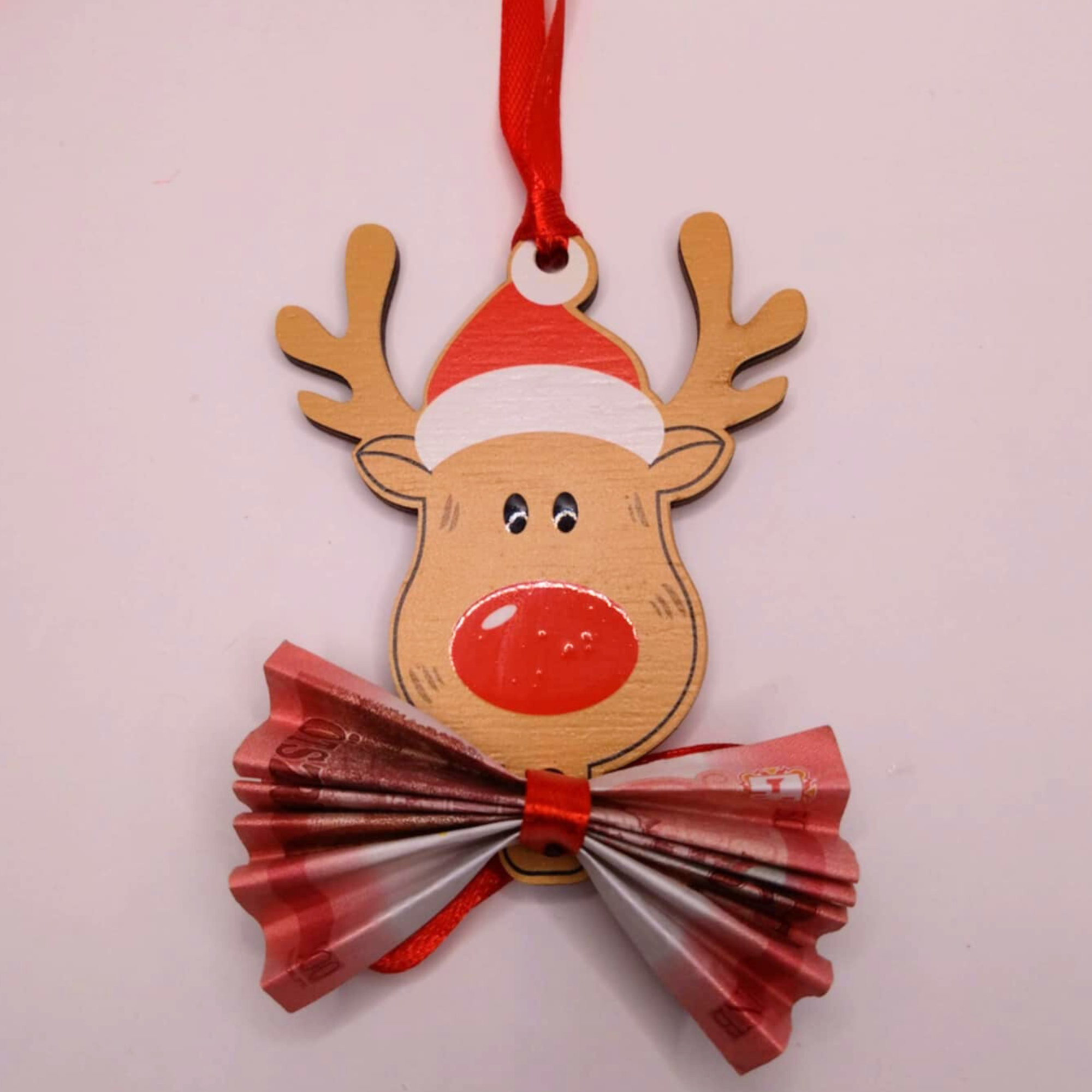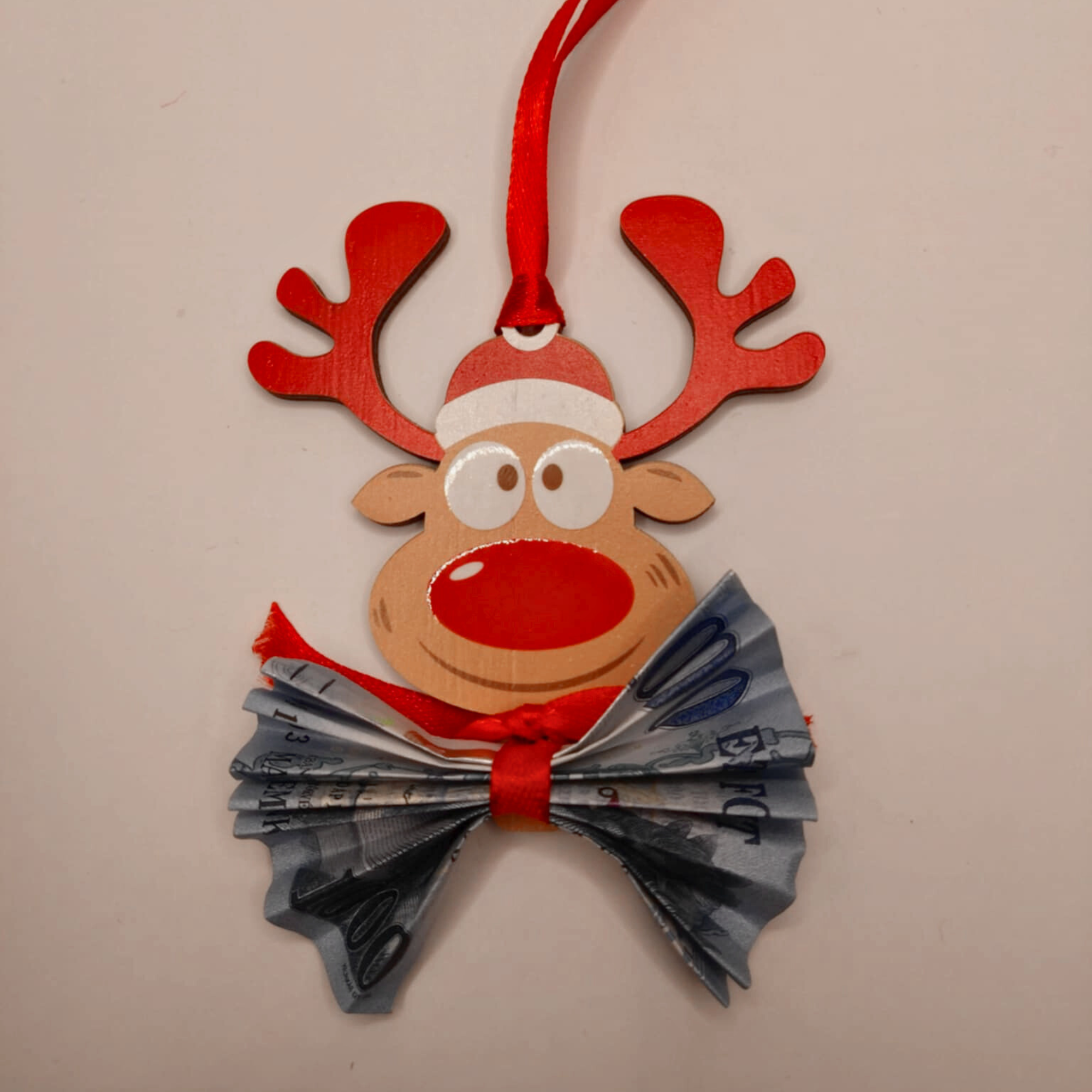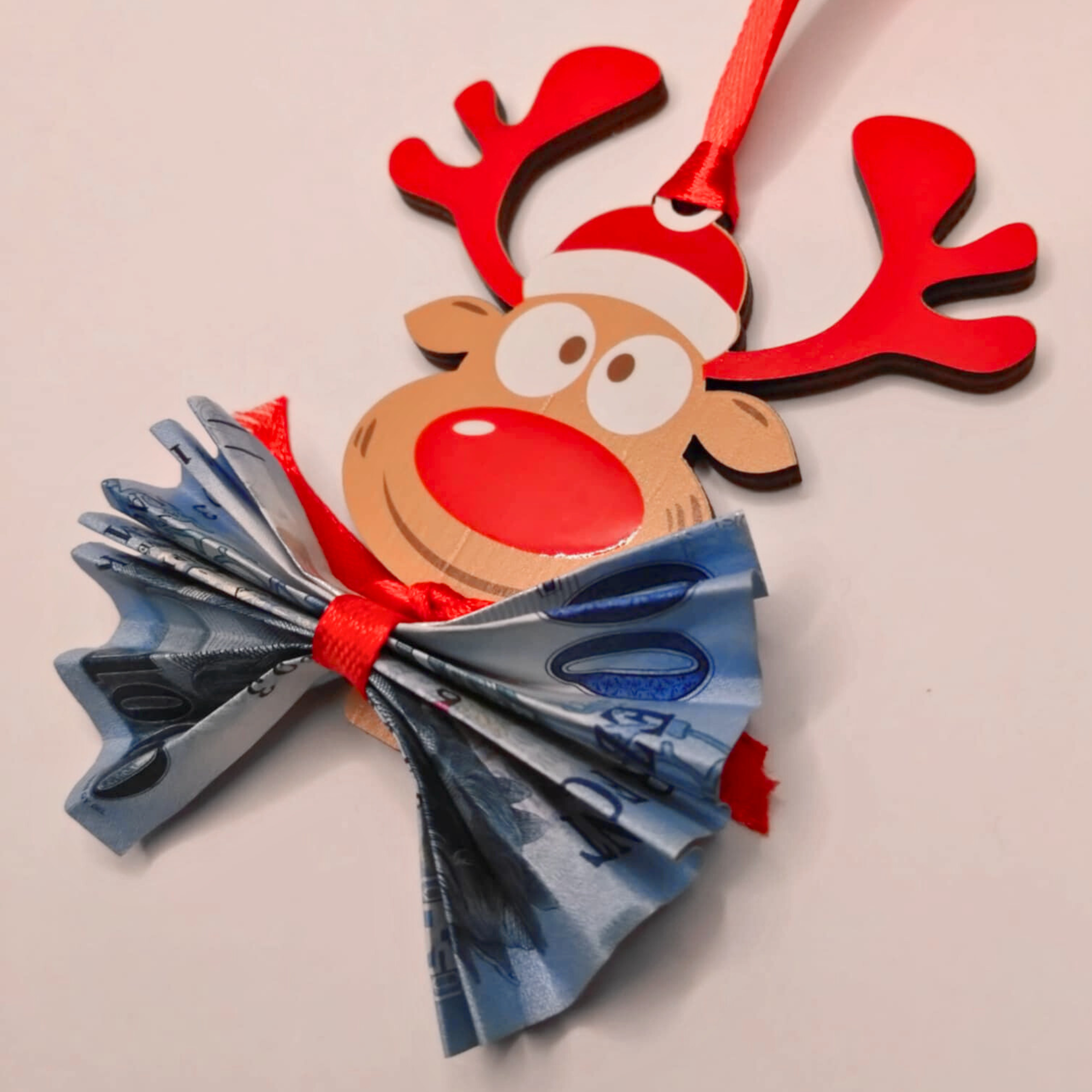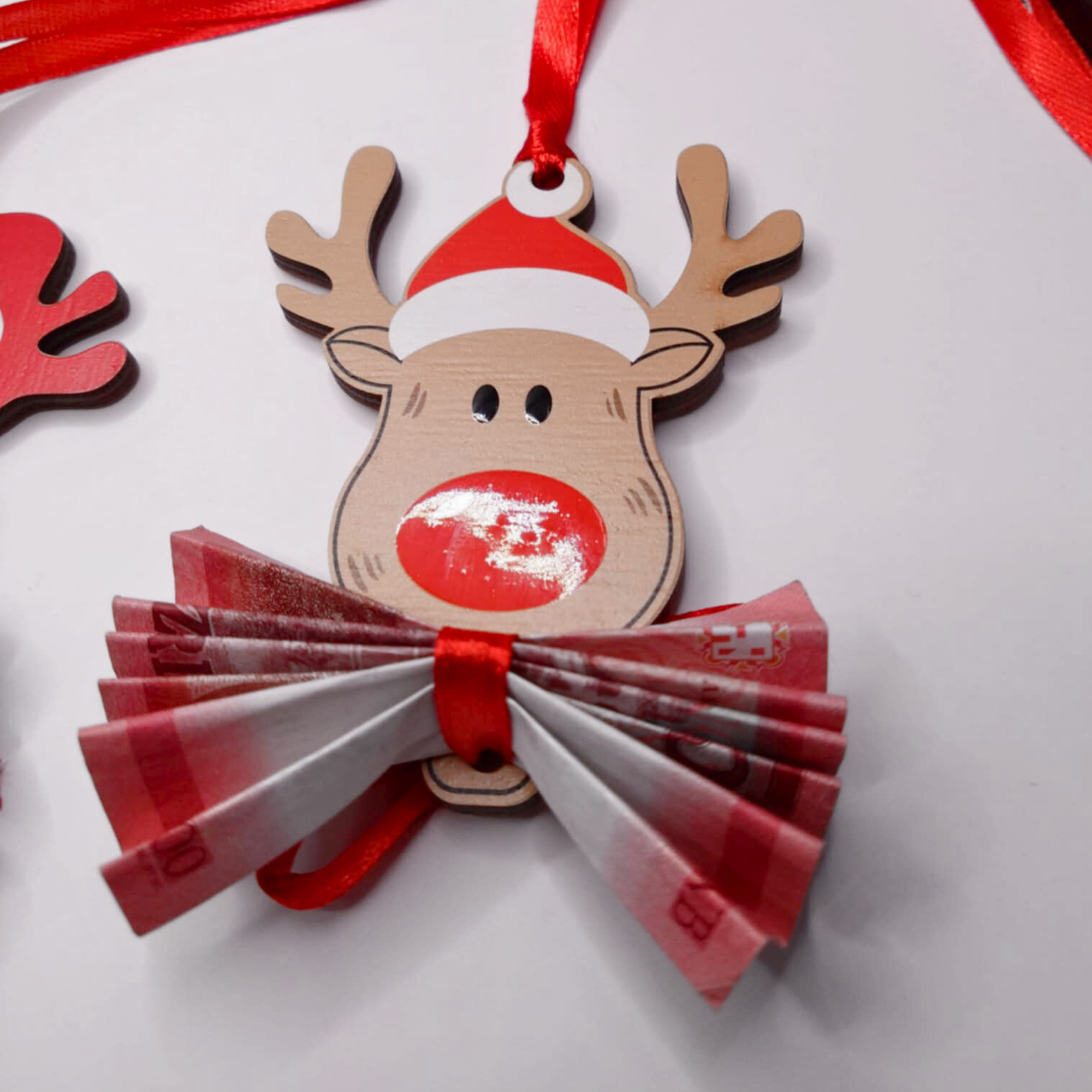 Ez az egyedi rénszarvas formájú dísz bükk rétegelt lemezből, UV nyomtatással készül, így prémium minőségű, tartós és részletgazdag termék. A nyakában elhelyezett, masni formájúra hajtott bankjegy az ajándékozás ötletes és elegáns módja. Vidám, modern, egyben hagyományőrző dísz, amely évről évre újra elővehető.