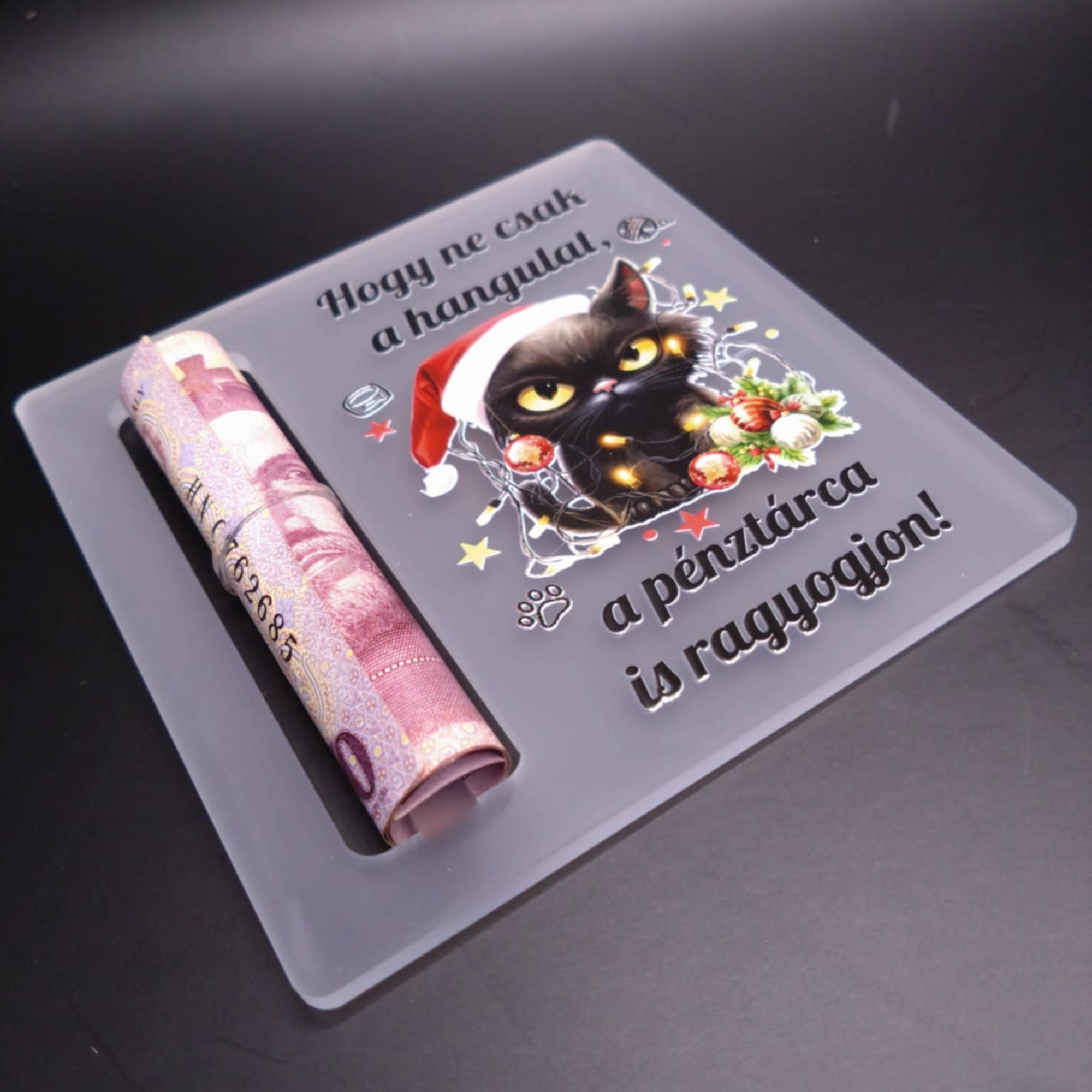 A kis fekete cica a karácsonyi fények között garantáltan feldobja az ajándékozás pillanatát – legyen szó családról, barátokról vagy kollégákról. Ezek az egyedi akril pénzátadók pont erre valók: egy csipet humor, egy kis karácsonyi hangulat, és máris több, mint egy egyszerű boríték.
