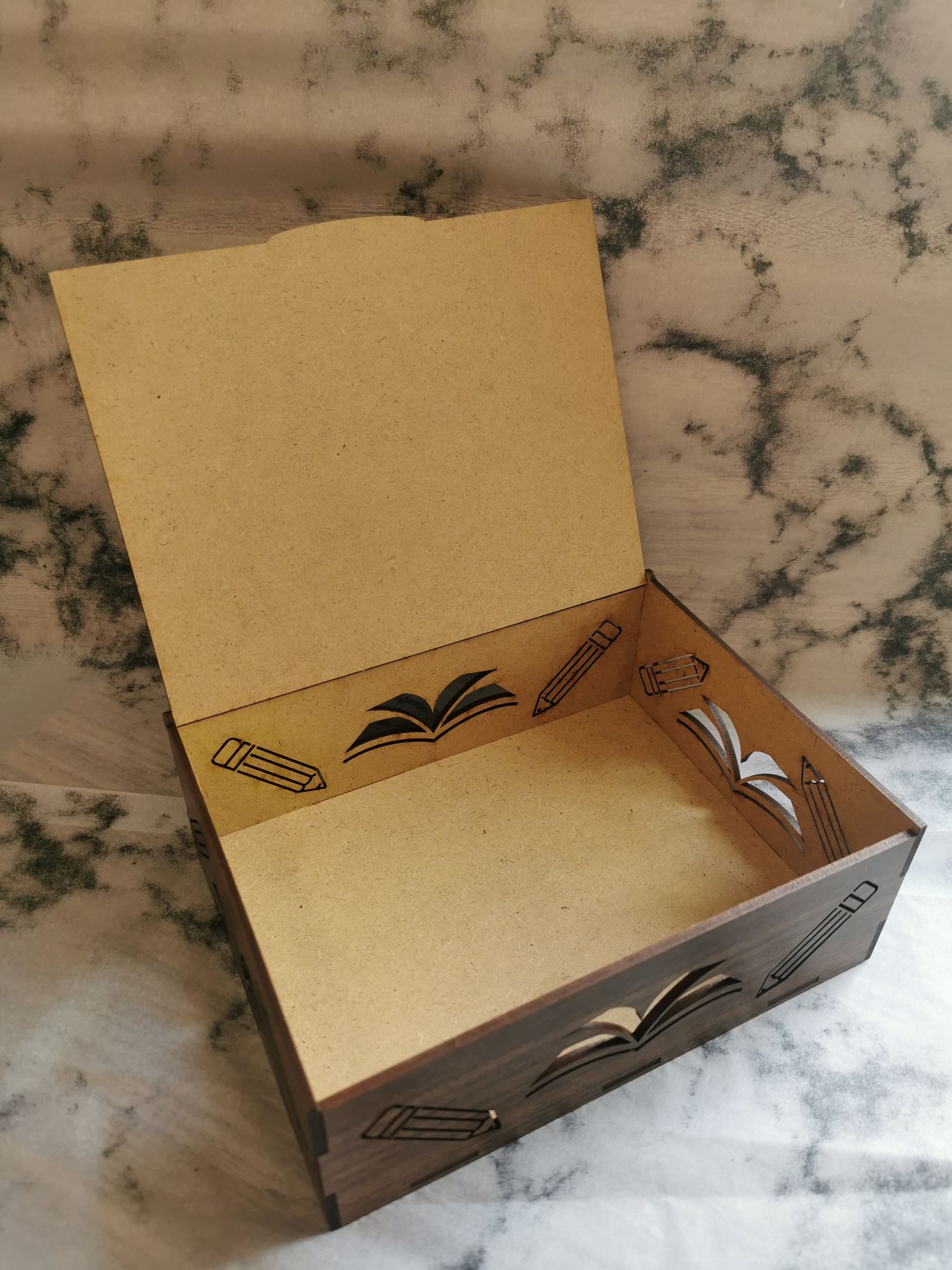 A HDF (High Density Fiberboard) farostból és gyantából préselt, nagy sűrűségű lemez. Gyakran újrahasznosított faanyagból készítik, ezzel minimalizálva a hulladékot, környezetbarátabbá téve a gyártási folyamatot. HDF lemezből készült termékeink lézertechnológiával készülnek, precíz lézervágónk egészen apró, összetett minták vágását is lehetővé teszi, így hihetetlenül részletes dizájnokat is tudunk készíteni. A lézer boxok többféle méretben és záródással készülnek, fedeleik külöböző módon mozognak. Az úgynevezett "living hinge" (élő zsanér) technológiával a sűrűn átvágott HDF lemezt hajlítani lehet, a szilárd 3 mm-es lemezből lekerekített éleket hozhatunk létre. A dobozok összeszerelése is változatos, van amelyik ragasztással történik, van amelyik egyszerűen egymásba pattanó, szorosan illeszkedő elemekből áll.