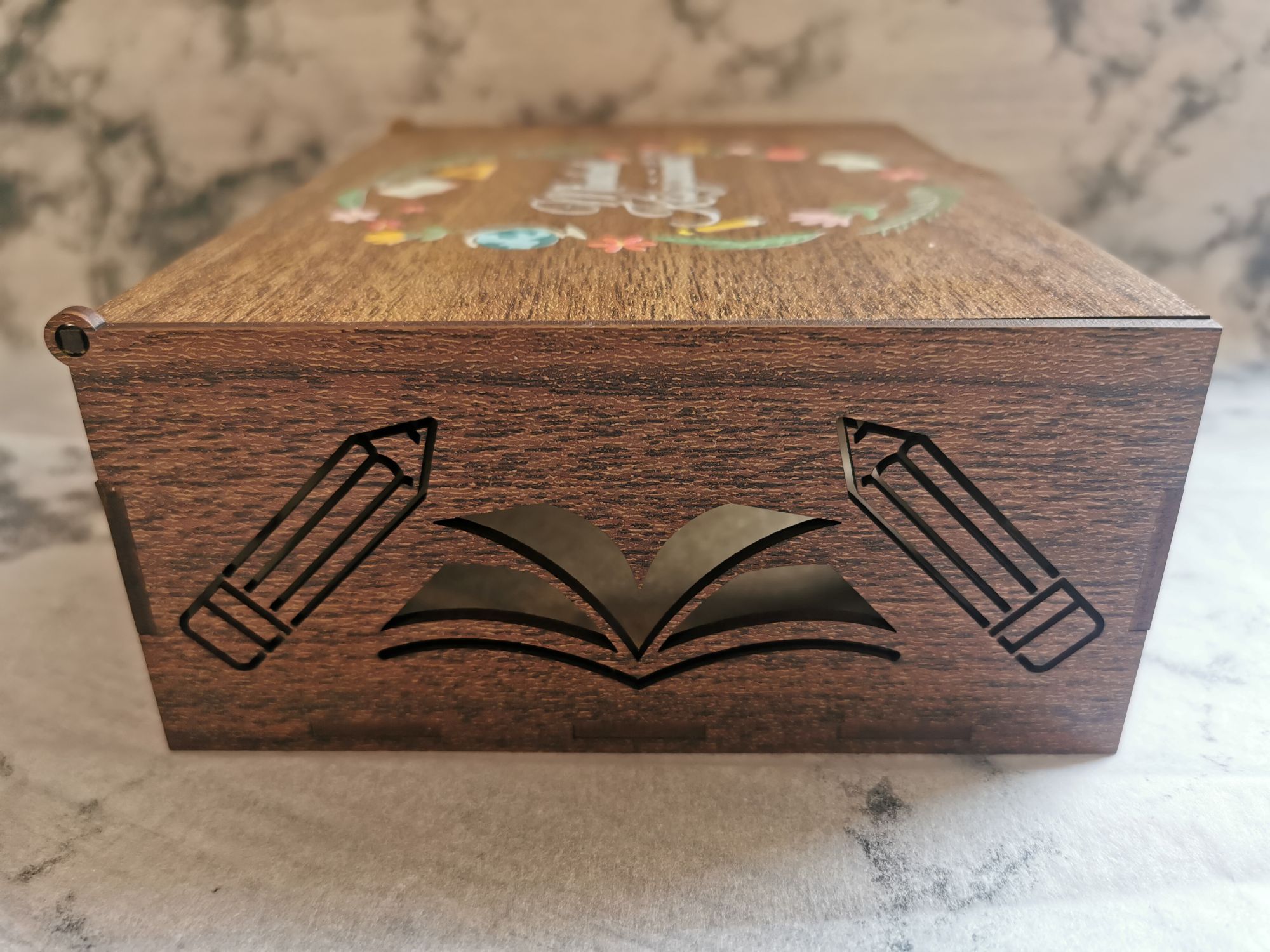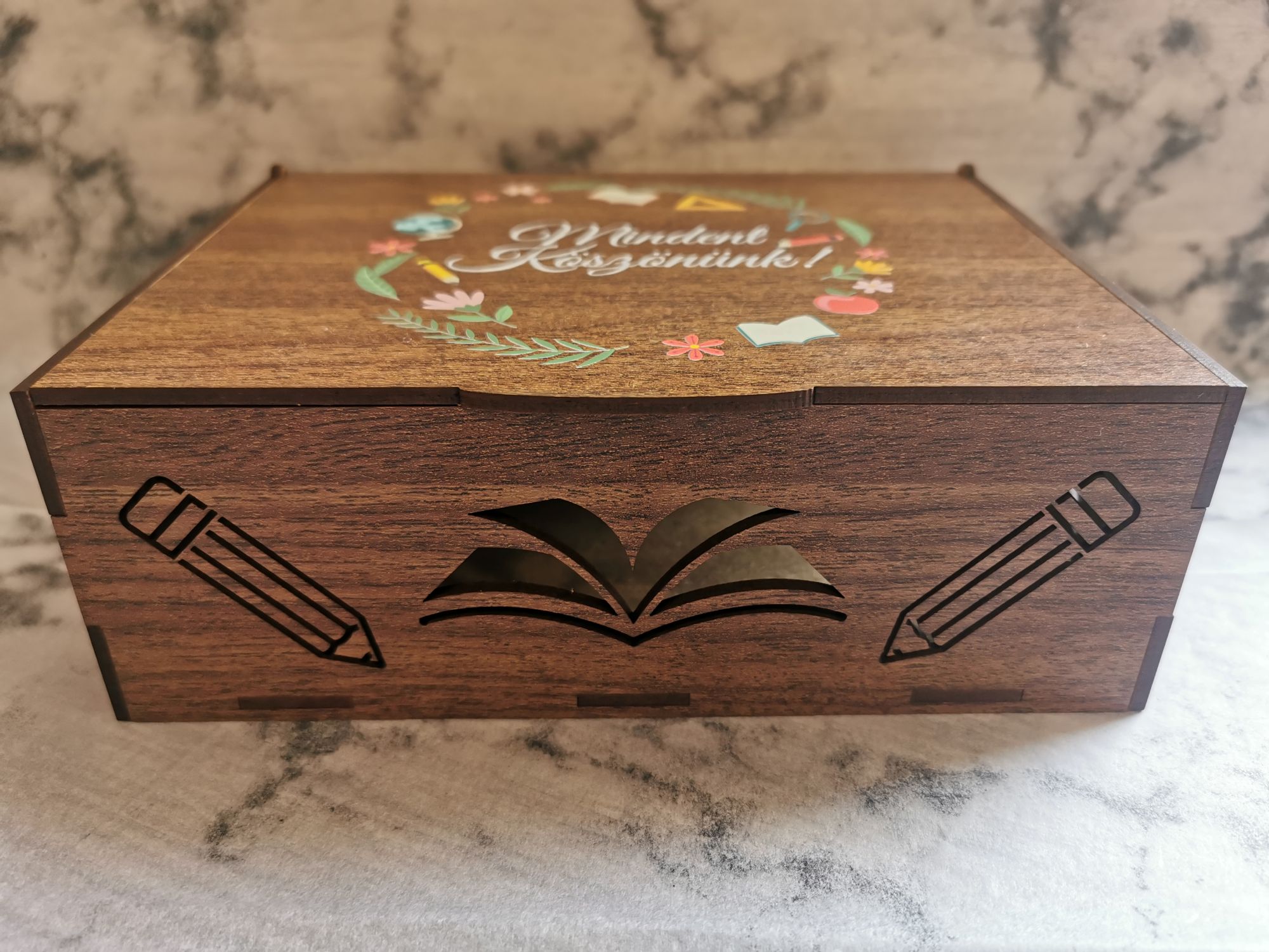 Ballagásra, pedagógusnapra készítettük ezt a dobozt, hogy stílusosan köszönhesd meg tanítók, tanárok kitartó munkáját. Oldalán áttört, lézervágott könyv és ceruza minta, tetején pedig színes, UV nyomtatással készült illsuztráció és felirat díszíti. Ajándékkártyák, készpénz, kisebb ajándéktárgyak átadására, a tanítványok jó kívánságai és üzenetei gyűjtésére elegáns megoldás, ha szeretnél egy olyan különleges, maradandó csomagolást, amit az ajándékozott később újra fel tud használni ahelyett, hogy azonnal a kukában landolna. Egyedi mintára és méretre kérj árajánlatot! Ajándékozz maradandó emléket!