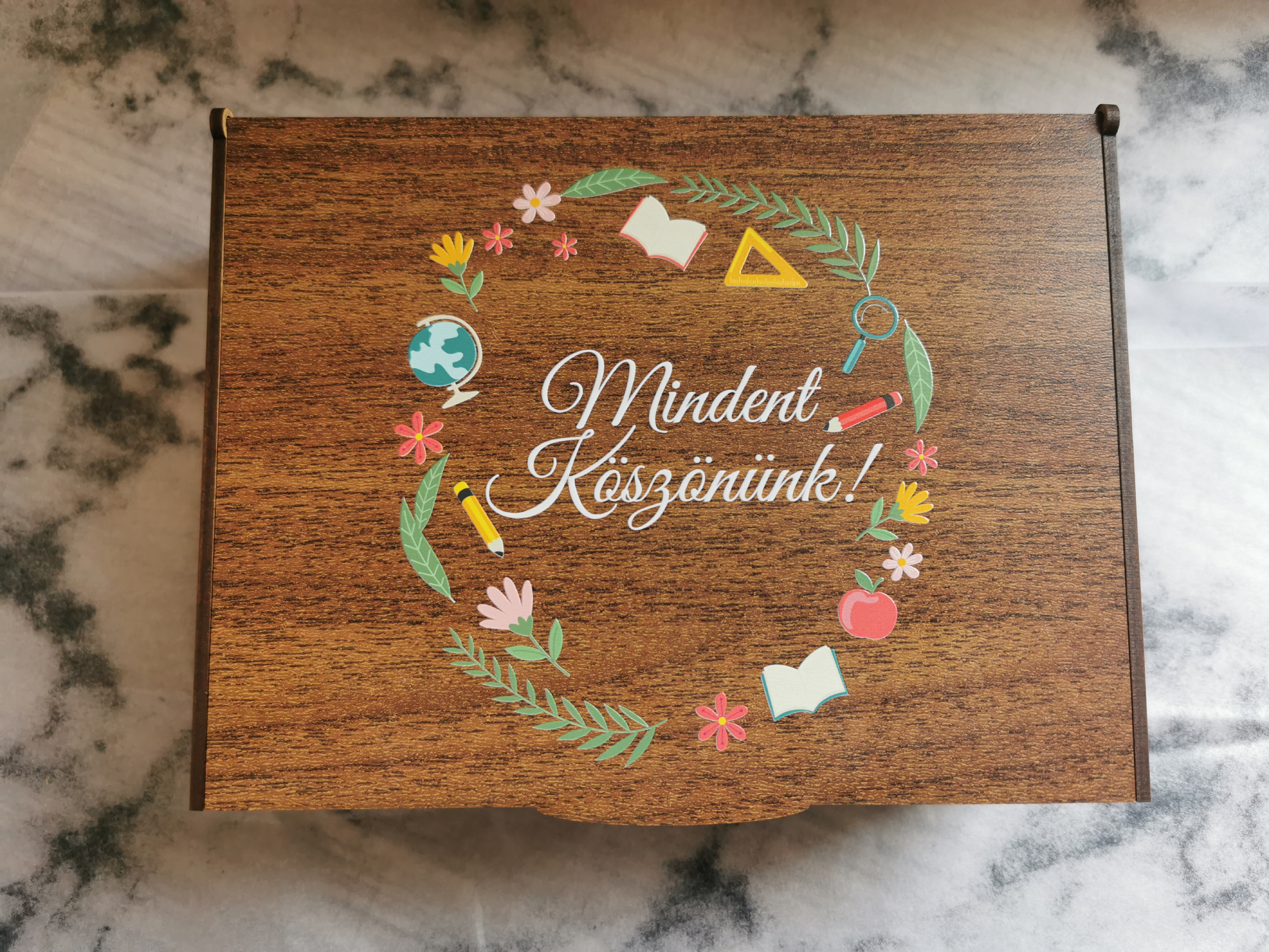 "Mindent Köszönünk!" ajándékátadó box tanárnak, pedagógusnak, 150 x 200 x 70 mm, nyomtatott HDF fedéllel