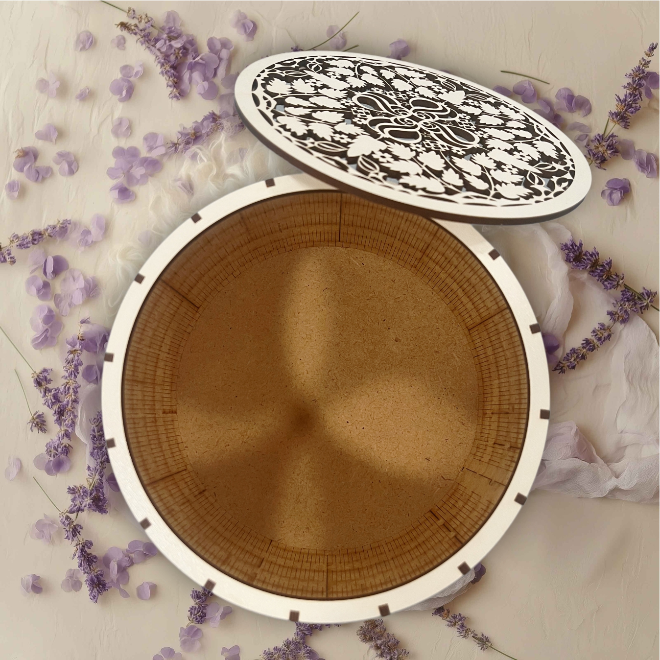 A lézervágott minta a doboz oldalán lehetővé teszi, hogy a szilárd HDF lemez körívesen hajoljon meg, ezzel egy elegáns, különleges dobozt alkotva. A finom csipke mintás tető precíziós lézerrel van kivágva, áttört mintája ideális pot pourri, egyéb száraz illatosítók tárolására, de természetesen bármit tárolhatsz benne, amit csak szeretnél. Készpénz, kisebb ajándéktárgyak átadására is tökéletes, ha szeretnél egy olyan különleges, maradandó csomagolást, amit az ajándékozott később újra fel tud használni ahelyett, hogy azonnal a kukában landolna. Több féle színben elérhető, így lakásod dekorjához tökéletesen passzol.