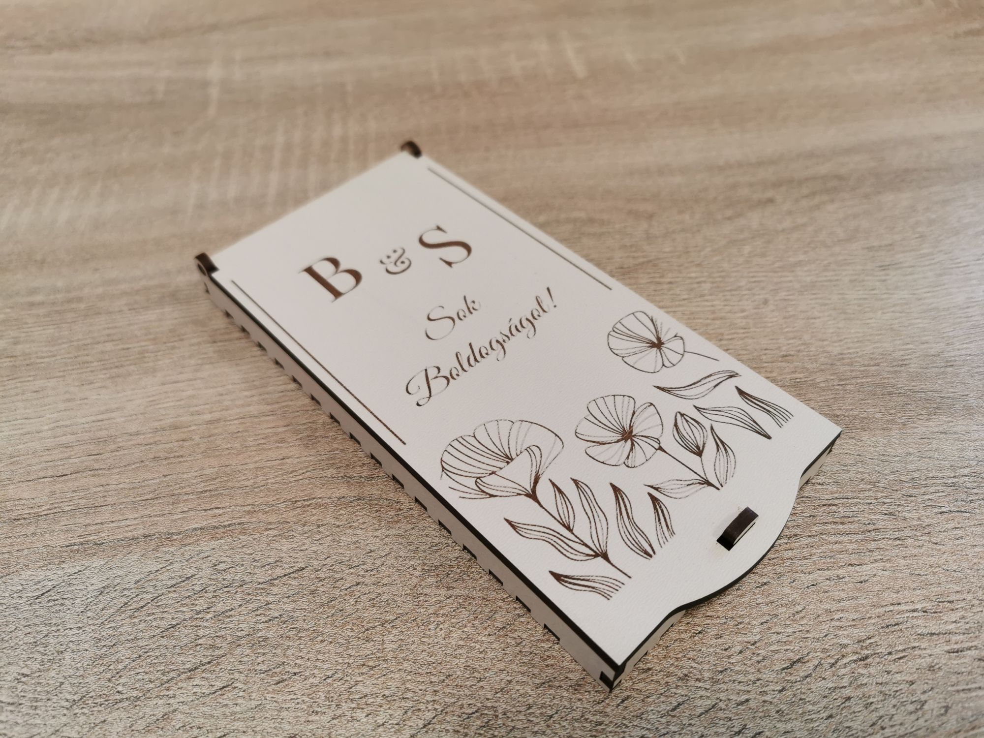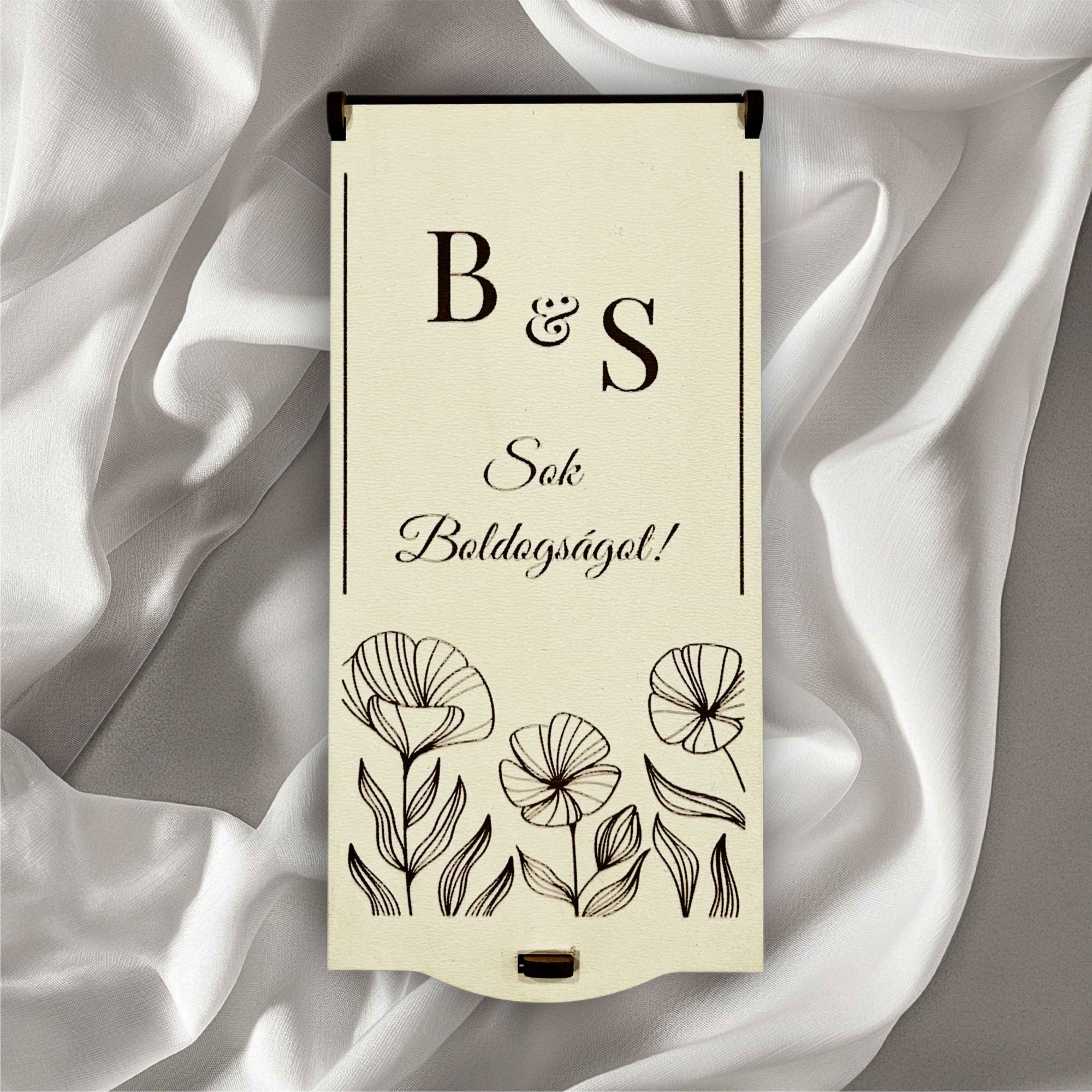 Tedd még különlegessebbé a nagy napot – ez a gravírozott virág mintás pénzátadó doboz tökéletes választás, ha pénzt ajándékoznál a friss házasoknak, de nem akarsz sablonos megoldással élni. A borítékoktól személyesebb, maradandó módja a készpénz átadásának egy lézervágott ajándékkísérő doboz. Rendelésnél az egyedi szöveg mezőbe írd be a pár monogramját.