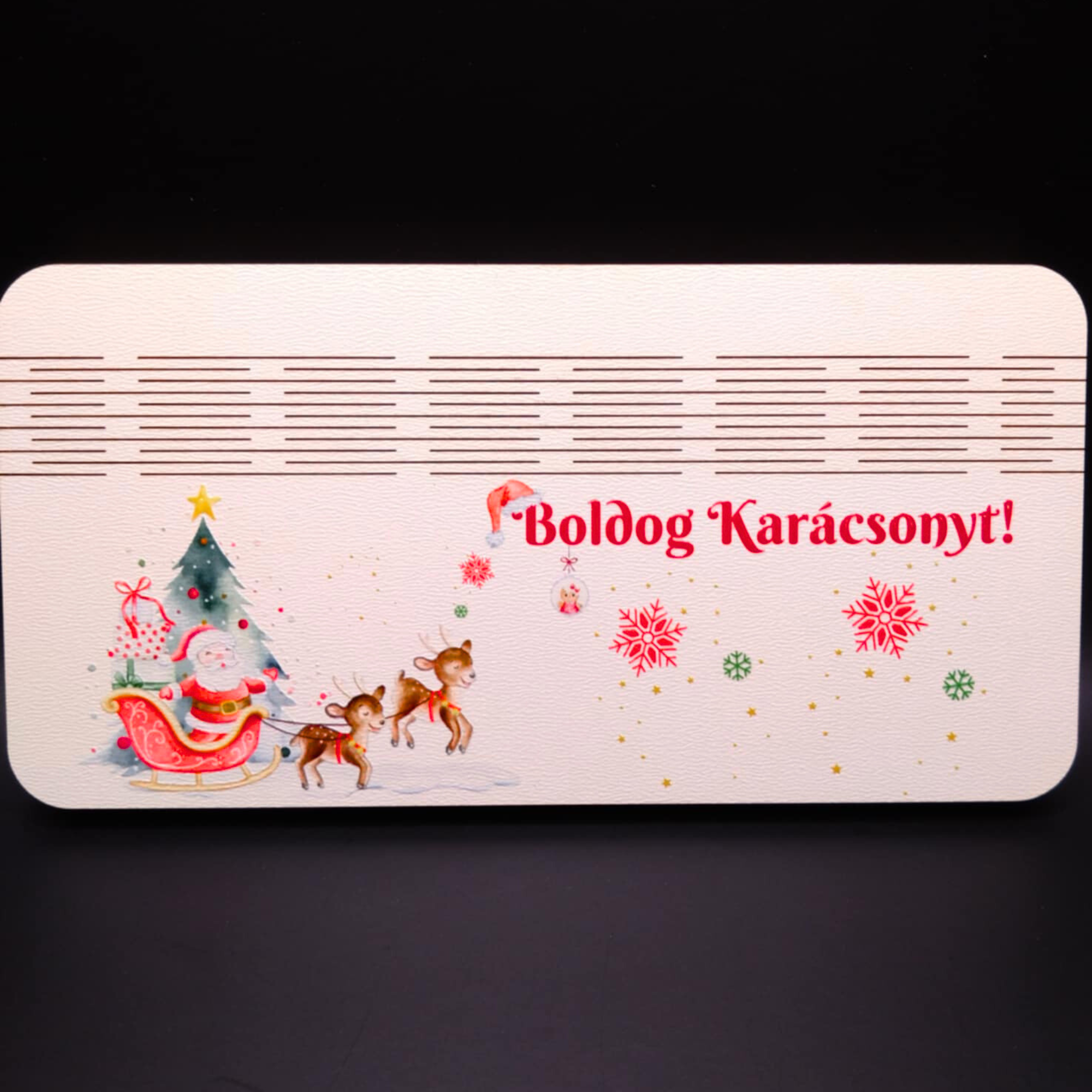 A kedves, mesés grafikájú Télapó és rénszarvas motívum tökéletes választás, ha játékos, de igényes karácsonyi ajándékot keresel. A HDF alapanyag tartósságot, a fényes UV-nyomat pedig modern eleganciát ad. Ez a pénzátadó nemcsak csomagolás, hanem maradandó emlék is.