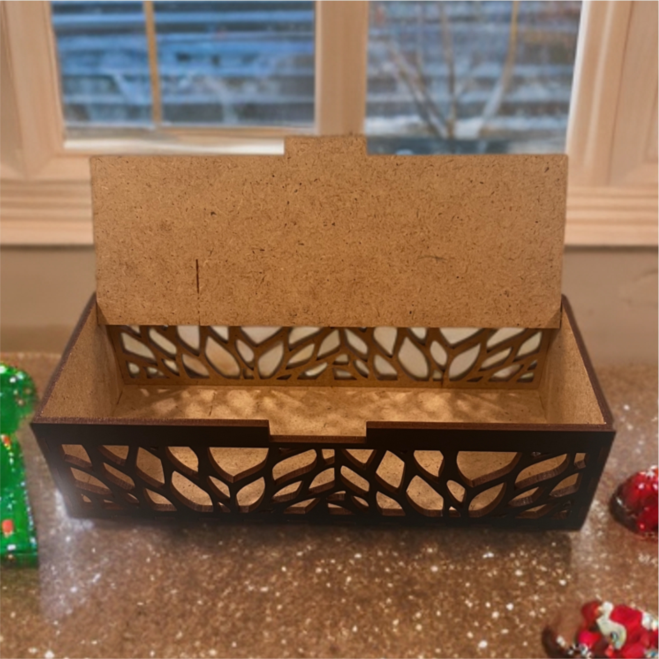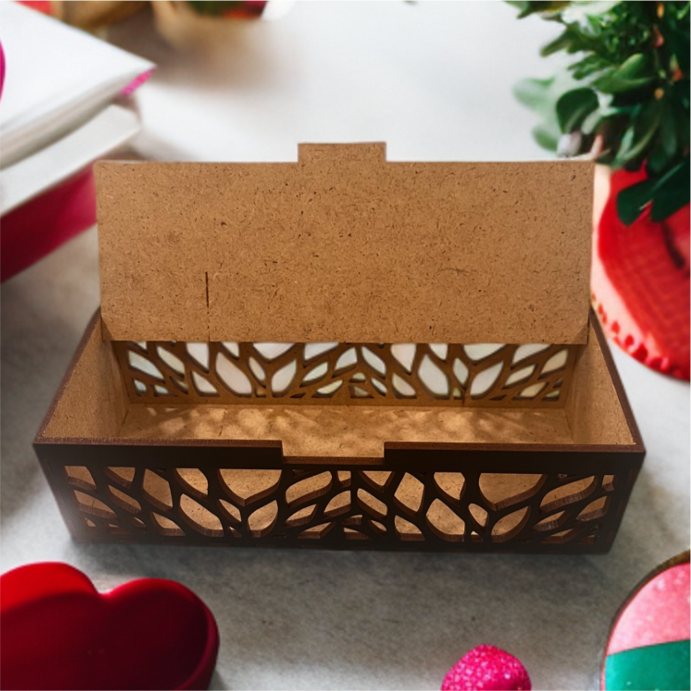 A HDF (High Density Fiberboard) farostból és gyantából préselt, nagy sűrűségű lemez. Gyakran újrahasznosított faanyagból készítik, ezzel minimalizálva a hulladékot, környezetbarátabbá téve a gyártási folyamatot. HDF lemezből készült termékeink lézertechnológiával készülnek, precíz lézervágónk egészen apró, összetett minták vágását is lehetővé teszi, így hihetetlenül részletes dizájnokat is tudunk készíteni. A lézer boxok többféle méretben és záródással készülnek, fedeleik külöböző módon mozognak. Az úgynevezett "living hinge" (élő zsanér) technológiával a sűrűn átvágott HDF lemezt hajlítani lehet, a szilárd 3 mm-es lemezből lekerekített éleket hozhatunk létre. A dobozok összeszerelése is változatos, van amelyik ragasztással történik, van amelyik egyszerűen egymásba pattanó, szorosan illeszkedő elemekből áll.