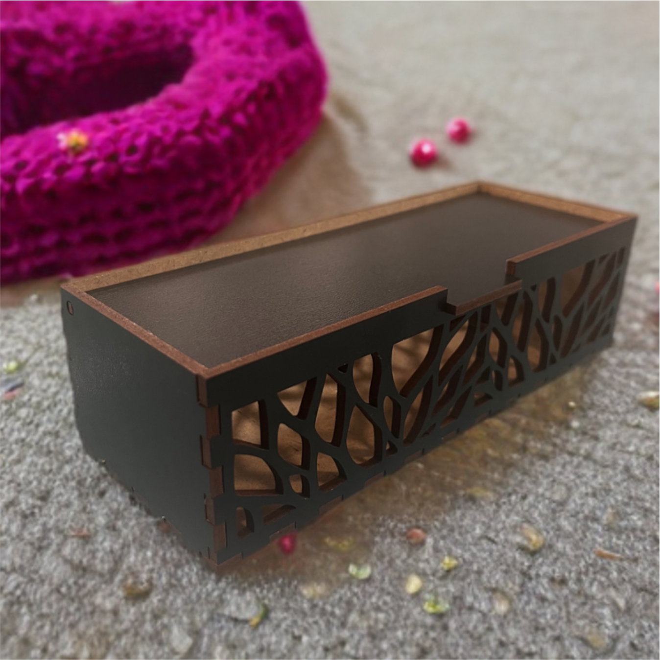 Az elegáns lézervágott minta a doboz elején és hátoldalán átengedi a fényt, megmutatja a doboz tartlamát. A tollak vagy ceruzák színei vidám megelenést kölcsönöznek íroasztalodnak, míg kényelmesen, egy helyen tárolják íroszereidet. A rövidebb oldalak teljesen zártak, így mozgatás közben sem csúsznak ki a tollak. Mérete ideális ceruzák, tollak, irodaszerek tárolására, de természetesen bármit tárolhatsz benne, amit csak szeretnél. Ajándékkártyák, készpénz, kisebb ajándéktárgyak átadására is tökéletes, ha szeretnél egy olyan különleges, maradandó csomagolást, amit az ajándékozott később újra fel tud használni ahelyett, hogy azonnal a kukában landolna.