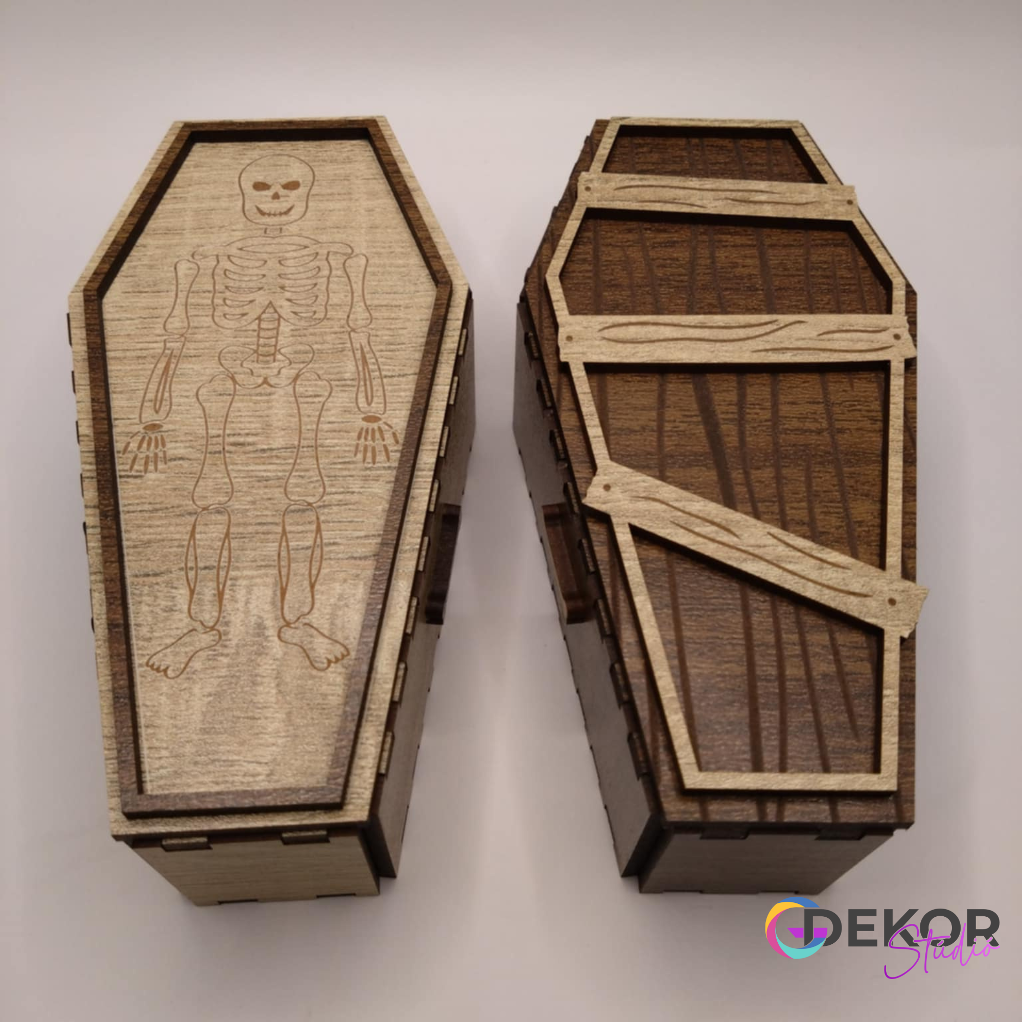 • Csontvázas koporsó – fedelén vidám csontváz motívummal.