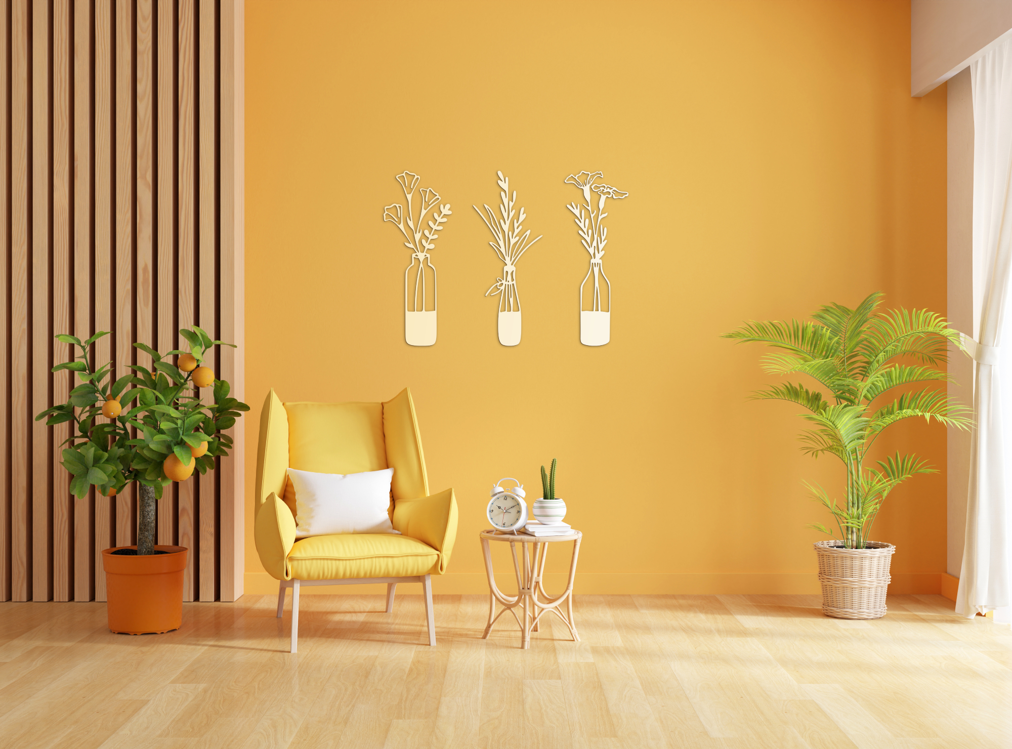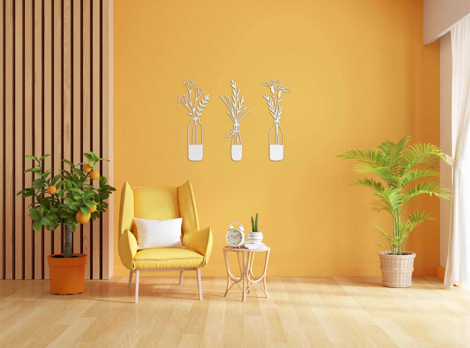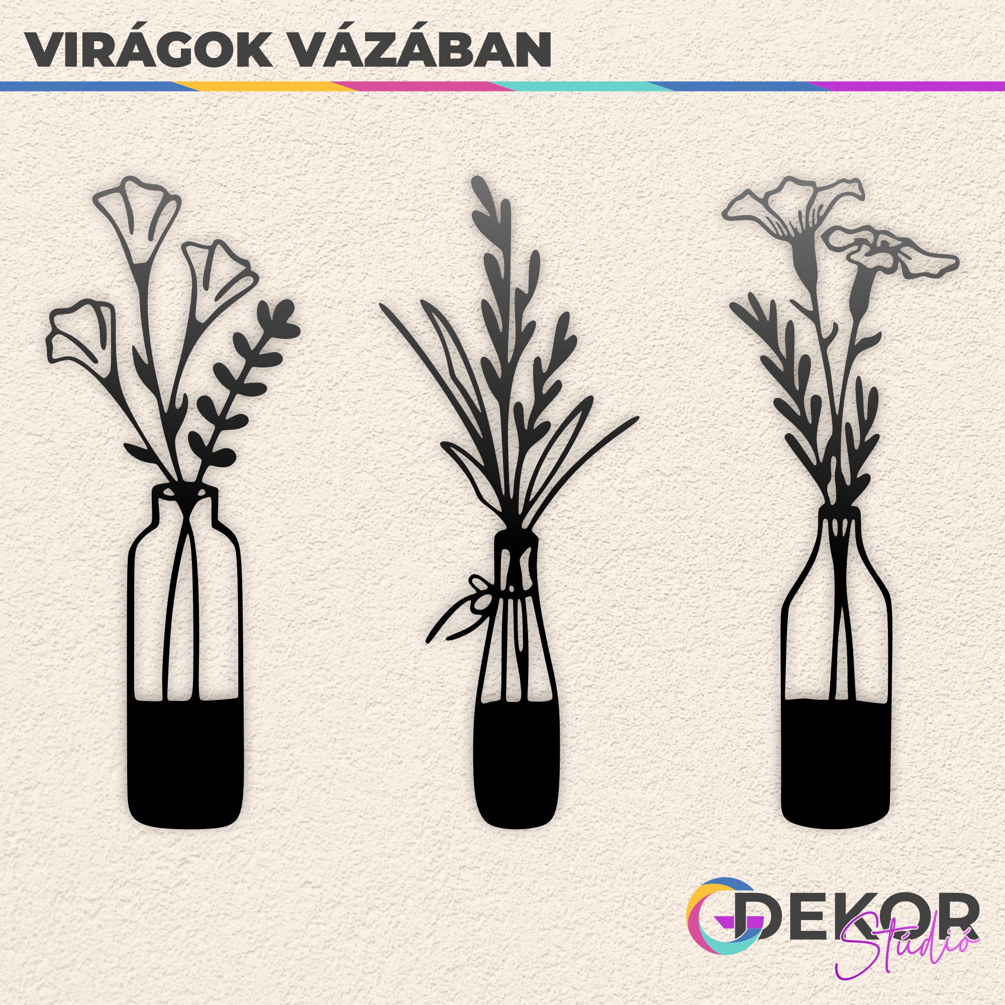 "Aki a virágot szereti, rossz ember nem lehet" tartja a mondás. A mi HDF lemezből lézervágott mintáink pedig egész évben virágzanak. Dobd fel nappalid üres falát, vagy vigyél egy vázányi vidámságot az ebédlőbe! Ideális választás kisebb helyiségekbe, ahol nincs hely valódi vázával dekorálni, azonban a sima 2 dimenziós falmatricáktól különlegsebb dekorációt szeretnél. A feltüntetett szélesség az egész szettre, a fotókon illusztrált elrendezésre vonatkozik, azonban az elemeket saját ízlésednek megfelelően, akár külön helyiségekben is elhelyezheted. Lehetőségeidnek csak a képzeleted szab határt. Az ár a teljes szettre értendő.