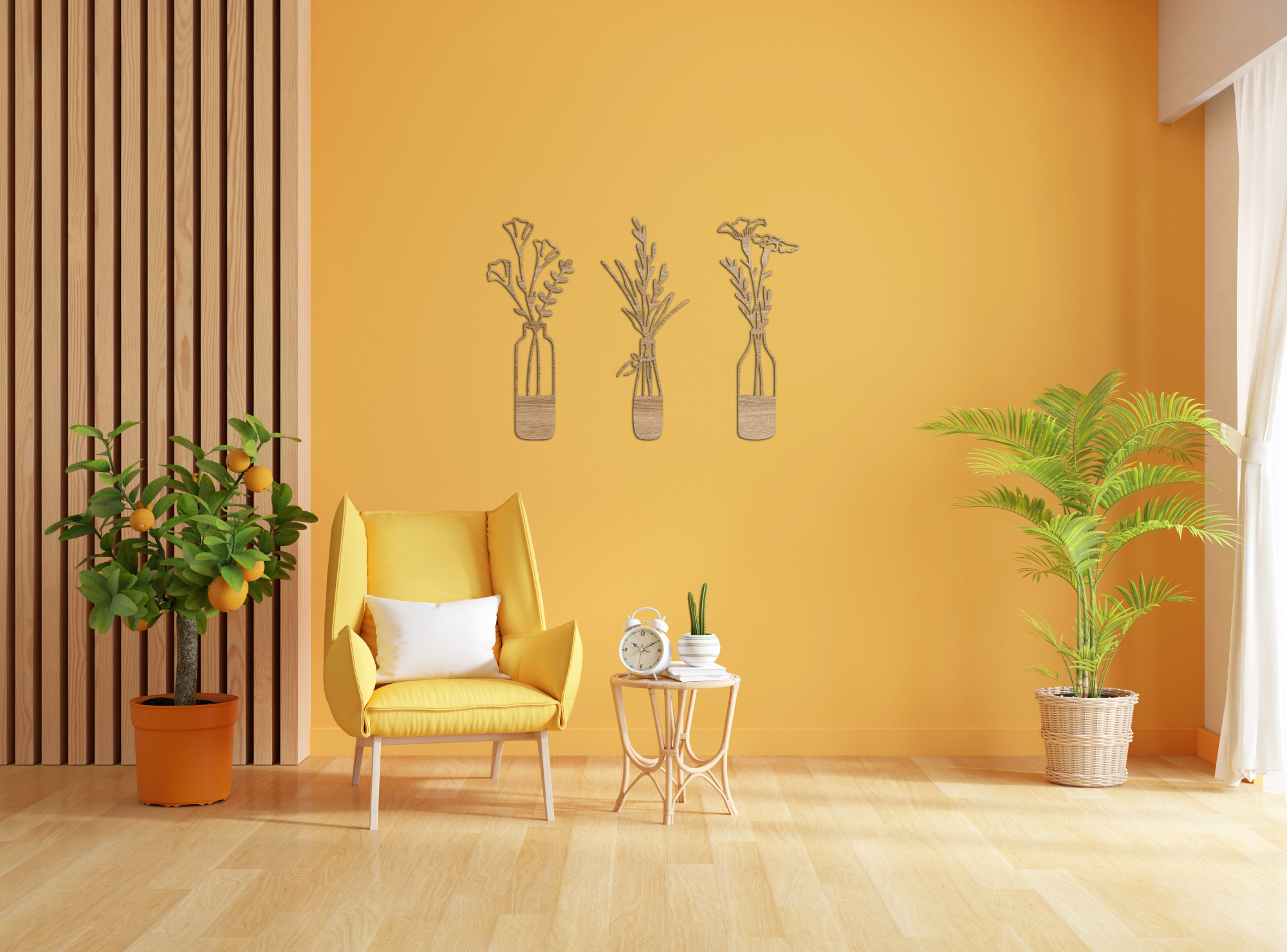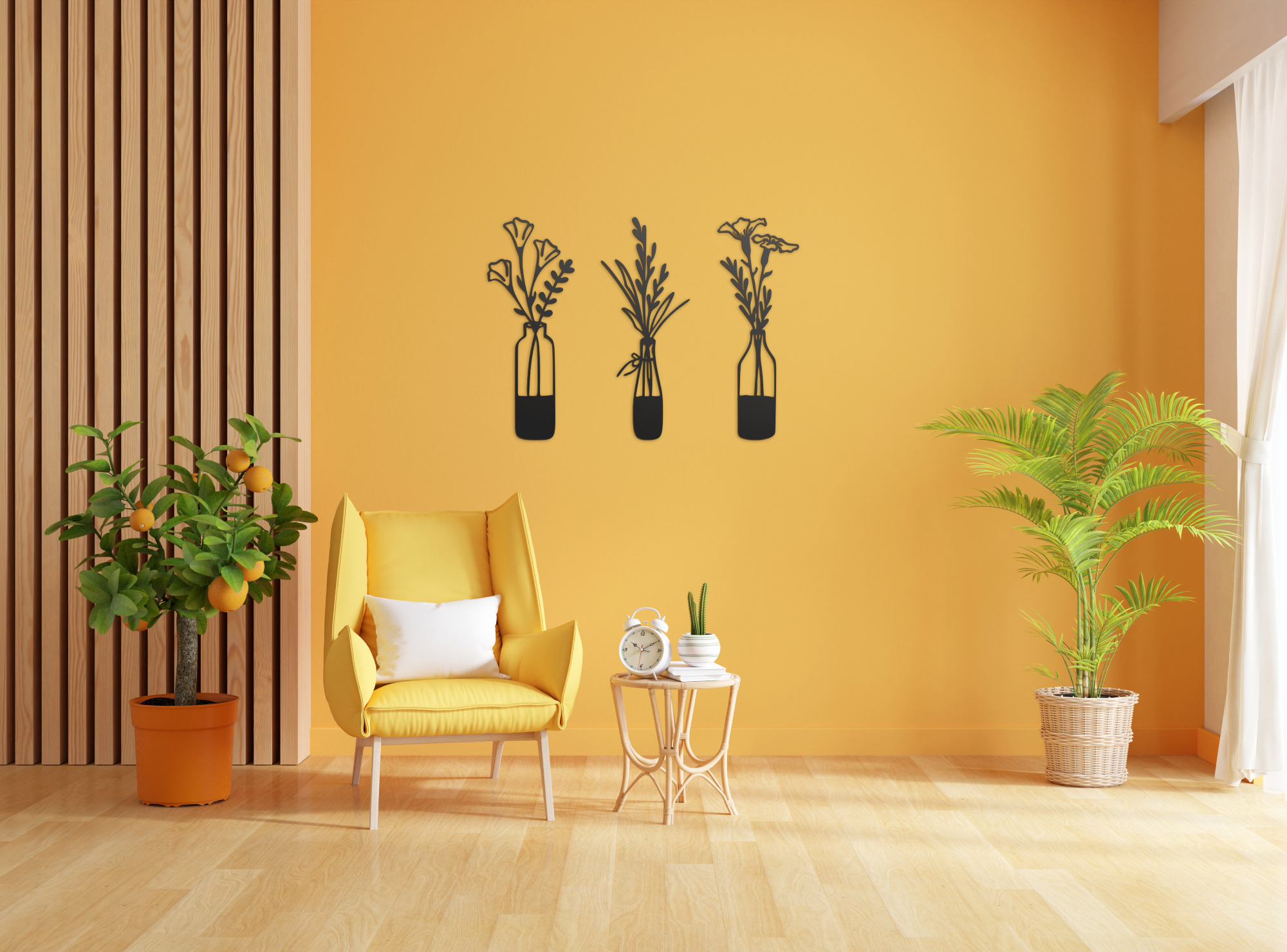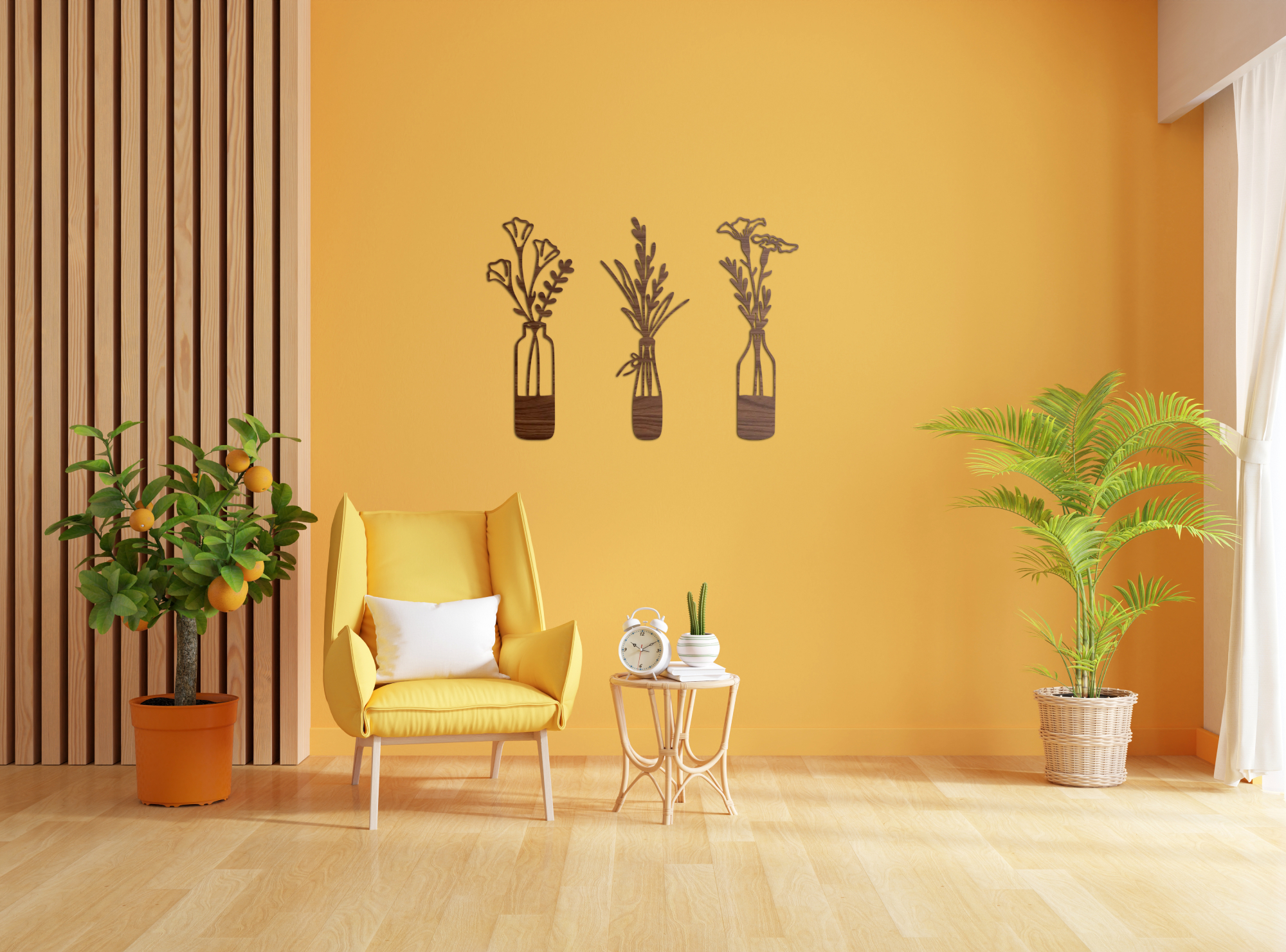 "Aki a virágot szereti, rossz ember nem lehet" tartja a mondás. A mi HDF lemezből lézervágott mintáink pedig egész évben virágzanak. Dobd fel nappalid üres falát, vagy vigyél egy vázányi vidámságot az ebédlőbe! Ideális választás kisebb helyiségekbe, ahol nincs hely valódi vázával dekorálni, azonban a sima 2 dimenziós falmatricáktól különlegsebb dekorációt szeretnél. A feltüntetett szélesség az egész szettre, a fotókon illusztrált elrendezésre vonatkozik, azonban az elemeket saját ízlésednek megfelelően, akár külön helyiségekben is elhelyezheted. Lehetőségeidnek csak a képzeleted szab határt. Az ár a teljes szettre értendő.